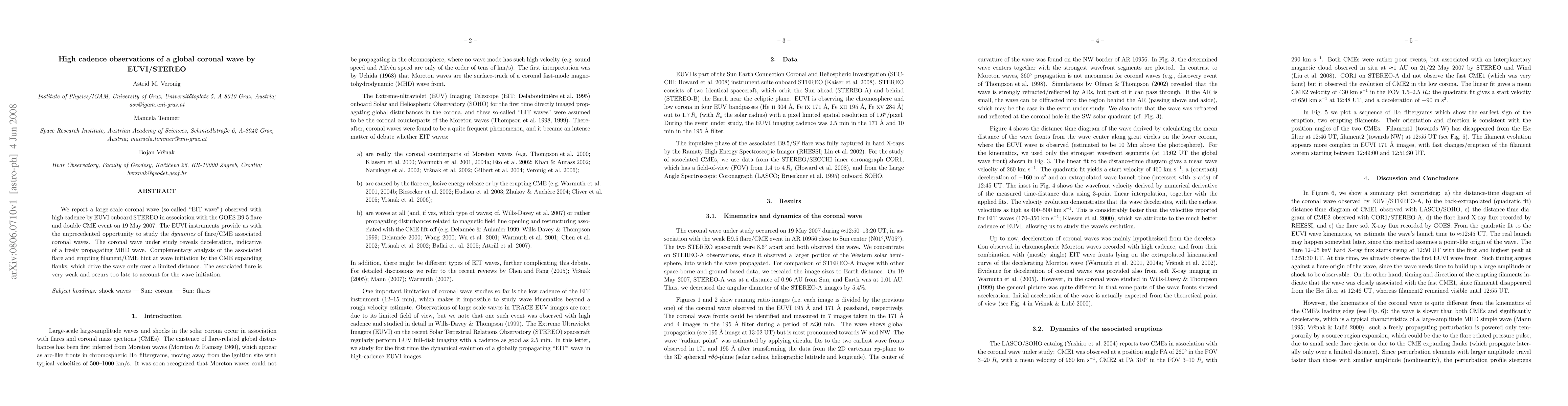 Researchers studied a large coronal wave observed with high cadence EUVI instruments in association with a solar flare and CME event, finding evidence of freely propagating MHD waves that were initiated by expanding flanks of the CME.