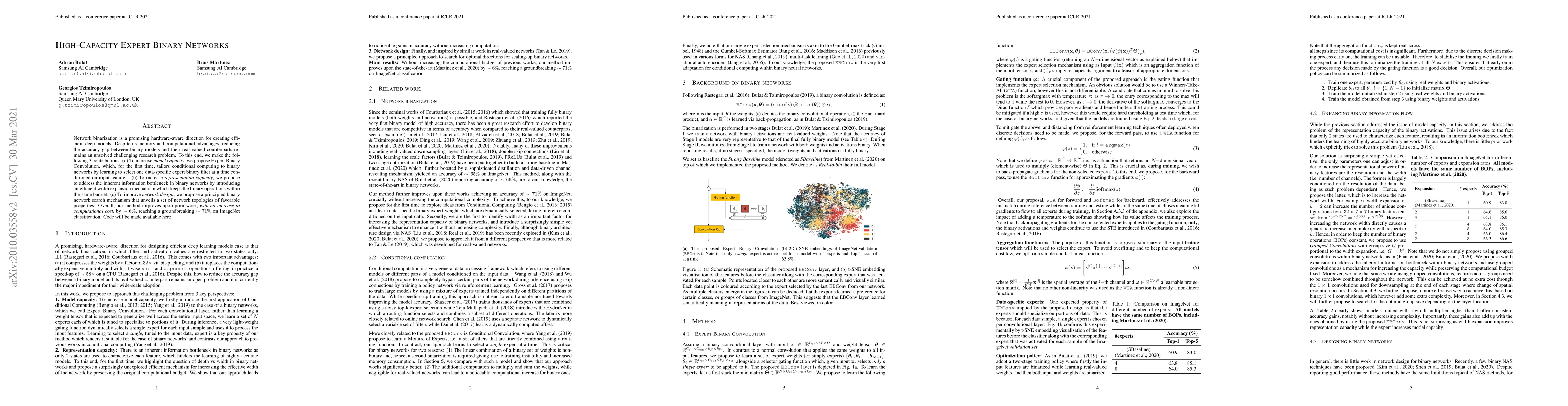 Network binarization is a promising hardware-aware direction for creating efficient deep models. Despite its memory and computational advantages, reducing the accuracy gap between binary models and their real-valued counterparts remains an unsolved challenging research problem. To this end, we make the following 3 contributions: (a) To increase model capacity, we propose Expert Binary Convolution, which, for the first time, tailors conditional computing to binary networks by learning to select one data-specific expert binary filter at a time conditioned on input features. (b) To increase representation capacity, we propose to address the inherent information bottleneck in binary networks by introducing an efficient width expansion mechanism which keeps the binary operations within the same budget. (c) To improve network design, we propose a principled binary network growth mechanism that unveils a set of network topologies of favorable properties. Overall, our method improves upon prior work, with no increase in computational cost, by $\sim6 \%$, reaching a groundbreaking $\sim 71\%$ on ImageNet classification. Code will be made available $\href{https://www.adrianbulat.com/binary-networks}{here}$.