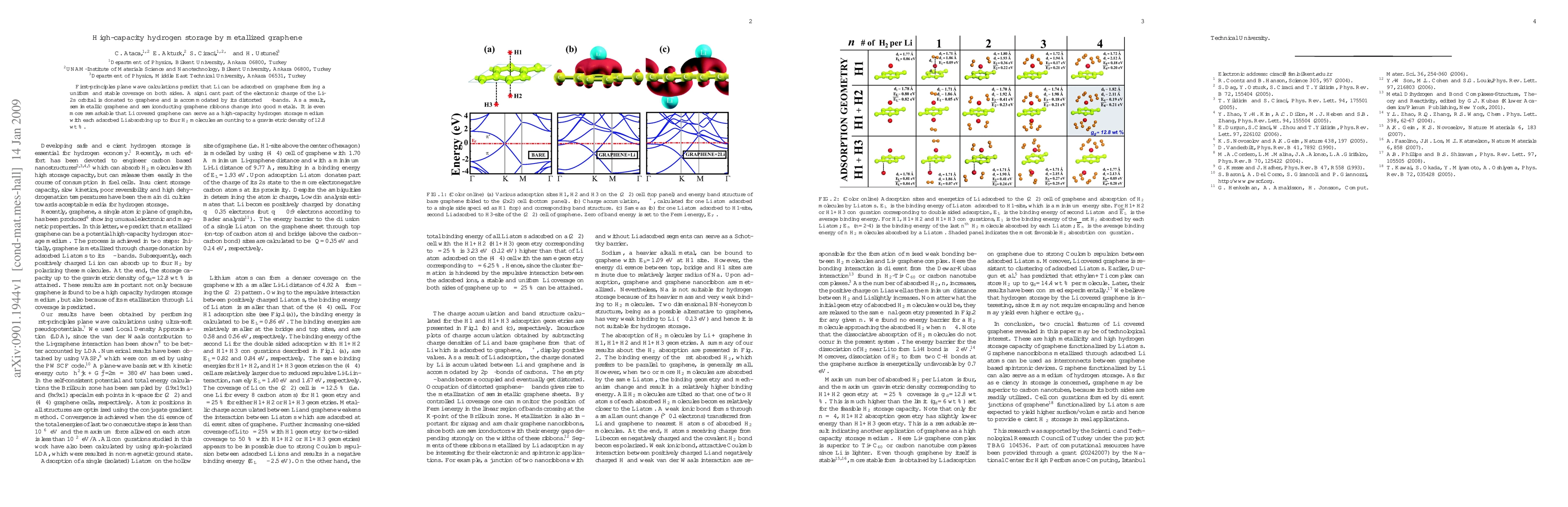 Metallized graphene can store up to 12.8 wt% of hydrogen, with each Li atom absorbing four H2 molecules, offering a promising high-capacity hydrogen storage solution.