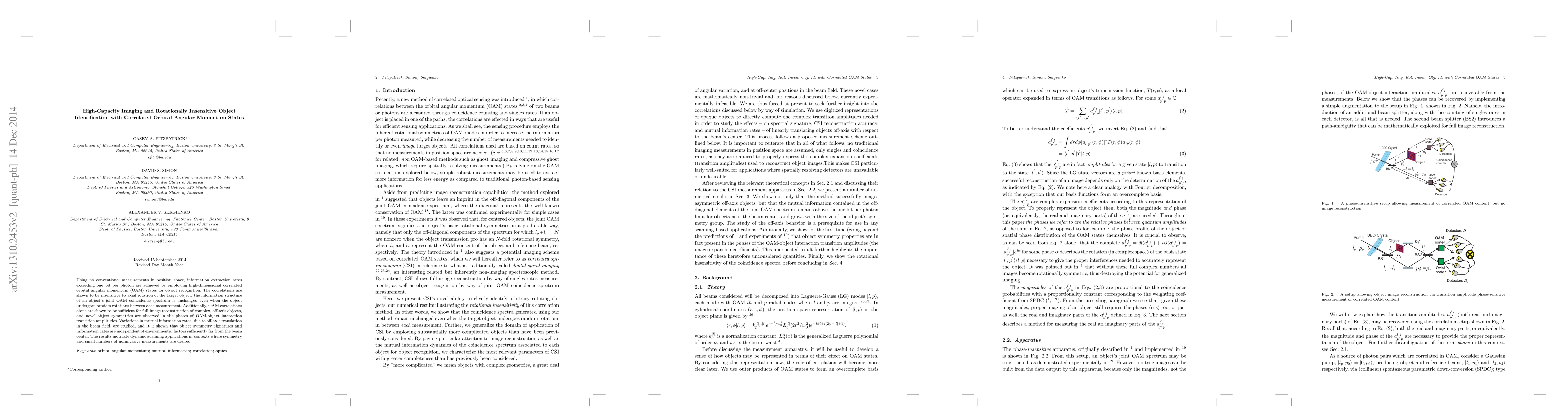 This paper demonstrates high-capacity imaging using correlated orbital angular momentum states for object identification, achieving information rates exceeding one bit per photon. The method is rotationally insensitive, maintaining object recognition even with axial rotations, and enables full image reconstruction of complex objects.