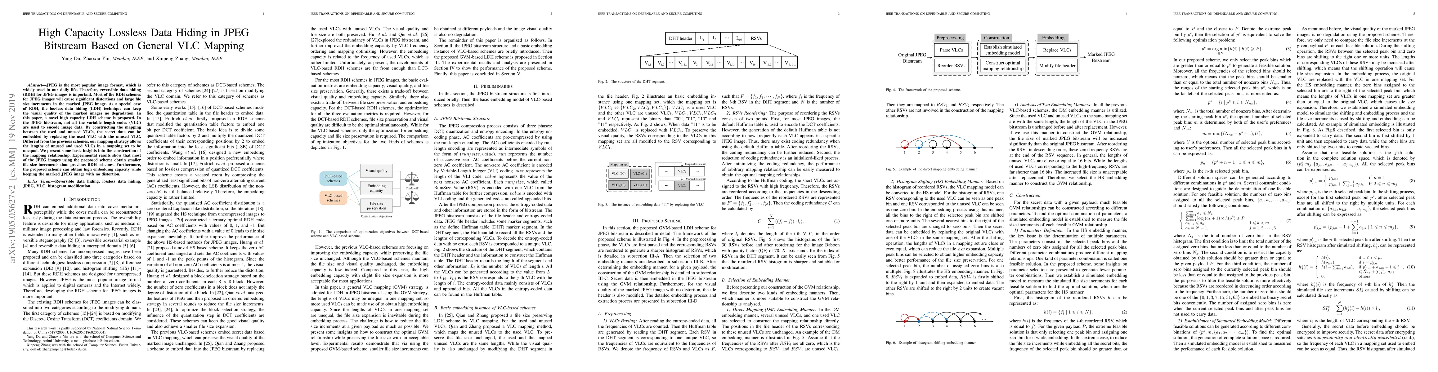 The paper proposes a high-capacity lossless data hiding scheme for JPEG images by constructing a Generalized Variable Length (GVL) Mapping (GVM) relationship. It differs from previous methods by allowing unequal VLC lengths in a mapping set, thus achieving high embedding capacity without visual quality degradation.