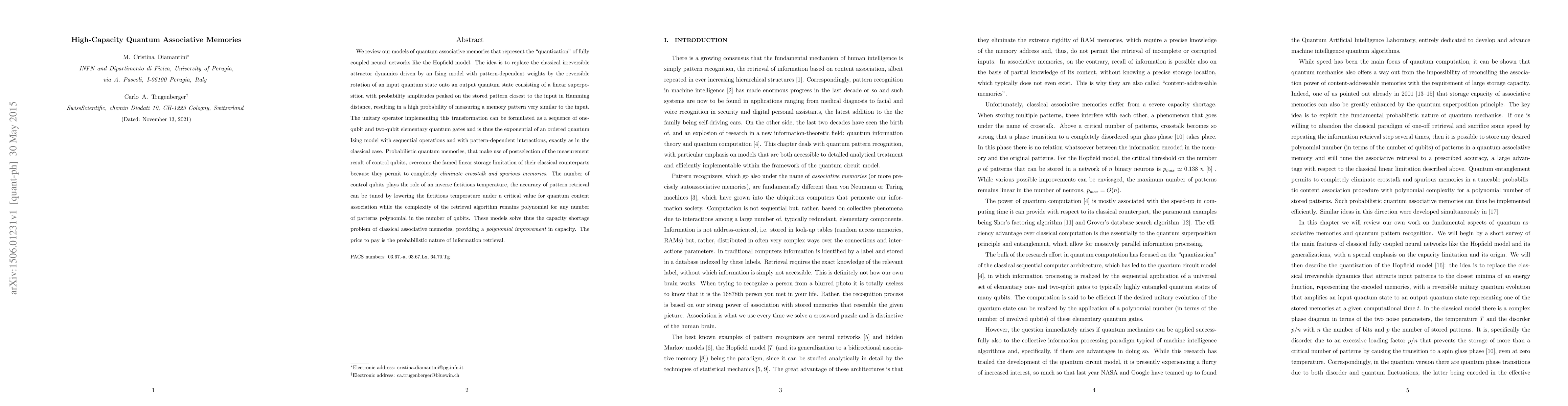 We review our models of quantum associative memories that represent the "quantization" of fully coupled neural networks like the Hopfield model. The idea is to replace the classical irreversible attractor dynamics driven by an Ising model with pattern-dependent weights by the reversible rotation of an input quantum state onto an output quantum state consisting of a linear superposition with probability amplitudes peaked on the stored pattern closest to the input in Hamming distance, resulting in a high probability of measuring a memory pattern very similar to the input. The unitary operator implementing this transformation can be formulated as a sequence of one-qubit and two-qubit elementary quantum gates and is thus the exponential of an ordered quantum Ising model with sequential operations and with pattern-dependent interactions, exactly as in the classical case. Probabilistic quantum memories, that make use of postselection of the measurement result of control qubits, overcome the famed linear storage limitation of their classical counterparts because they permit to completely {\it eliminate crosstalk and spurious memories}. The number of control qubits plays the role of an inverse fictitious temperature, the accuracy of pattern retrieval can be tuned by lowering the fictitious temperature under a critical value for quantum content association while the complexity of the retrieval algorithm remains polynomial for any number of patterns polynomial in the number of qubits. These models solve thus the capacity shortage problem of classical associative memories, providing a {\it polynomial improvement} in capacity. The price to pay is the probabilistic nature of information retrieval.