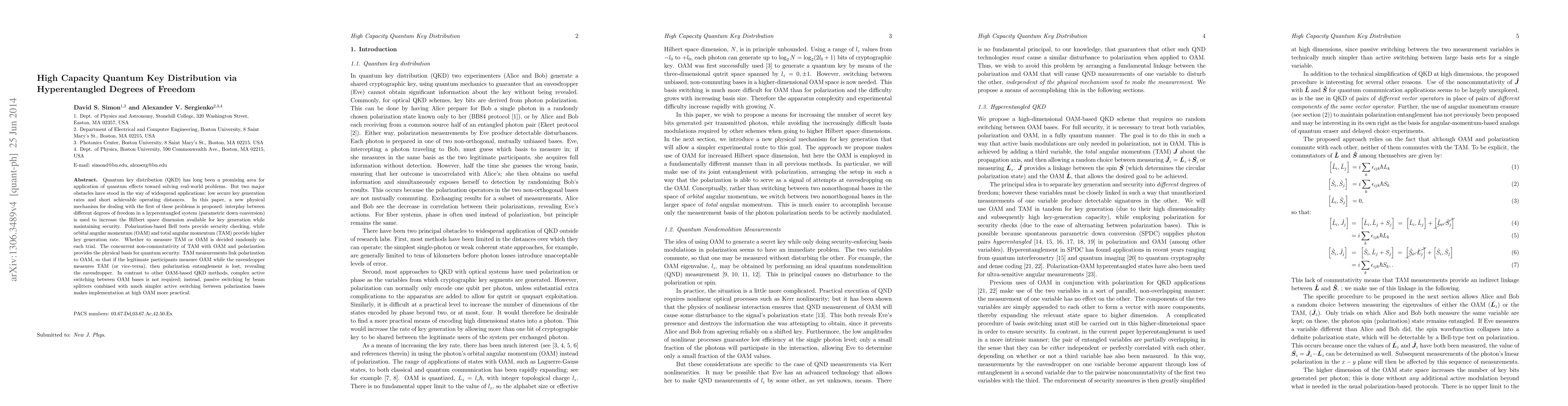 Quantum key distribution (QKD) has long been a promising area for application of quantum effects toward solving real-world problems. But two major obstacles have stood in the way of widespread applications: low secure key generation rates and short achievable operating distances. In this paper, a new physical mechanism for dealing with the first of these problems is proposed: interplay between different degrees of freedom in a hyperentangled system (parametric down conversion) is used to increase the Hilbert space dimension available for key generation while maintaining security. Polarization-based Bell tests provide security checking, while orbital angular momentum (OAM) and total angular momentum (TAM) provide higher key generation rate. Whether to measure TAM or OAM is decided randomly on each trial. The concurrent non-commutativity of TAM with OAM and polarization provides the physical basis for quantum security. TAM measurements link polarization to OAM, so that if the legitimate participants measure OAM while the eavesdropper measures TAM (or vice-versa), then polarization entanglement is lost, revealing the eavesdropper. In contrast to other OAM-based QKD methods, complex active switching between OAM bases is not required; instead, passive switching by beam splitters combined with much simpler active switching between polarization bases makes implementation at high OAM more practical.