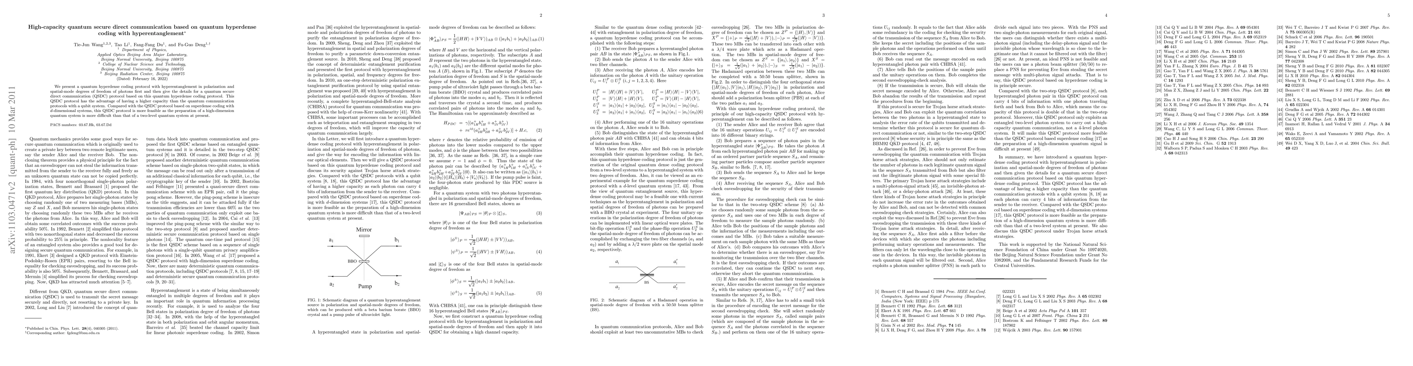 This paper proposes a quantum secure direct communication protocol utilizing quantum hyperdense coding with hyperentanglement in photon polarization and spatial-mode degrees of freedom, offering higher capacity than qubit-based protocols and being more practical due to easier preparation of two-level quantum systems.