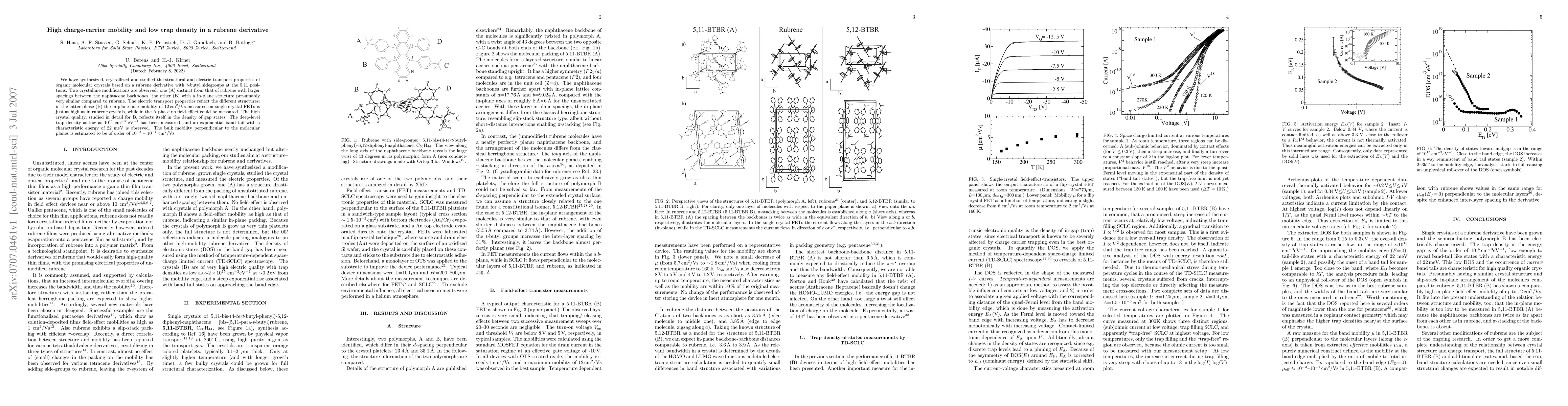 This paper reports on the synthesis and study of a rubrene derivative with t-butyl sidegroups, revealing two crystalline modifications. The in-plane hole mobility in the B phase is as high as in rubrene, while the A phase shows no field-effect. The B phase exhibits high crystal quality with a low trap density of 10^15 cm^-3 eV^-1.