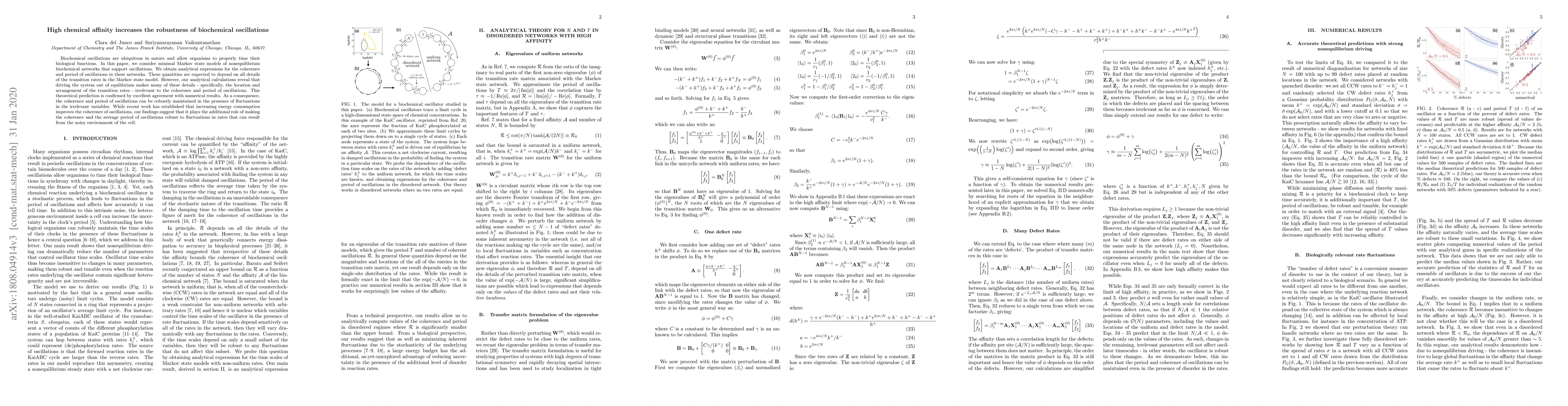 This paper demonstrates that high chemical affinity in biochemical oscillations enhances robustness by making coherence and period of oscillations largely independent of specific transition rate details, confirmed by analytical and numerical agreement. Increased energy consumption not only improves coherence but also makes oscillations robust against fluctuations in transition rates due to cellular noise.