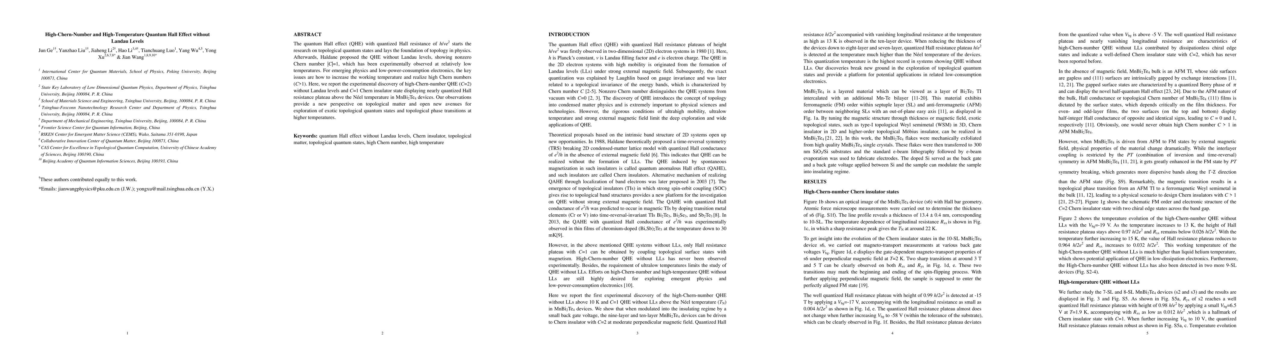 This paper reports the experimental discovery of high-Chern-number quantum Hall effect (QHE) with C=2 and C=1 Chern insulator states in MnBi2Te4 devices, demonstrating nearly quantized Hall resistance plateaus above the Néel temperature, thus advancing the exploration of topological quantum states and phase transitions at higher temperatures.