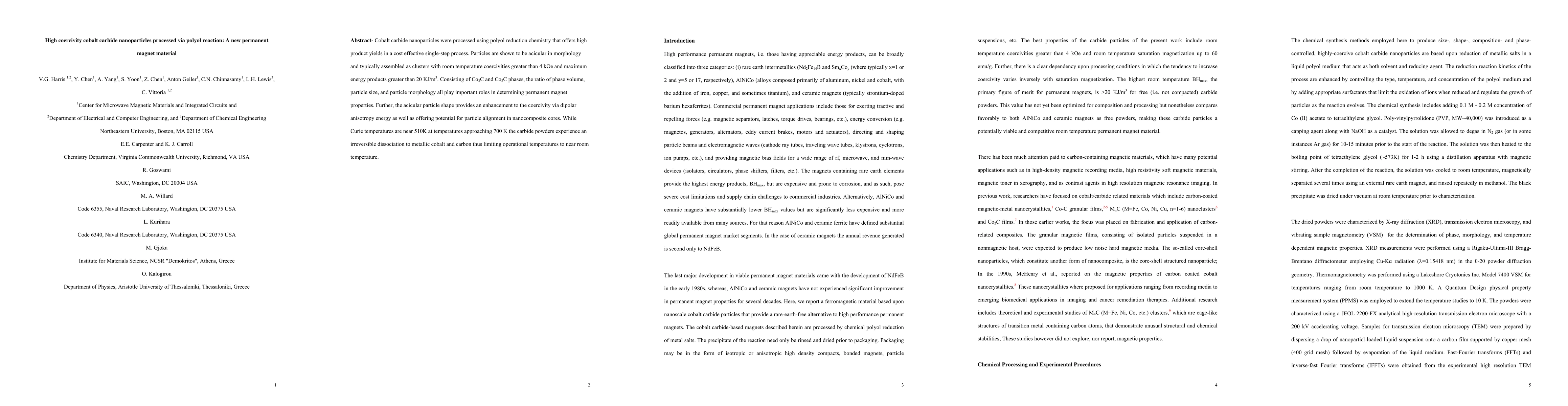 Cobalt carbide nanoparticles synthesized via polyol reaction exhibit high coercivity and energy products, making them promising candidates for permanent magnet applications. The acicular morphology and phase composition significantly enhance coercivity and energy product, though operational temperature is limited due to dissociation at higher temperatures.