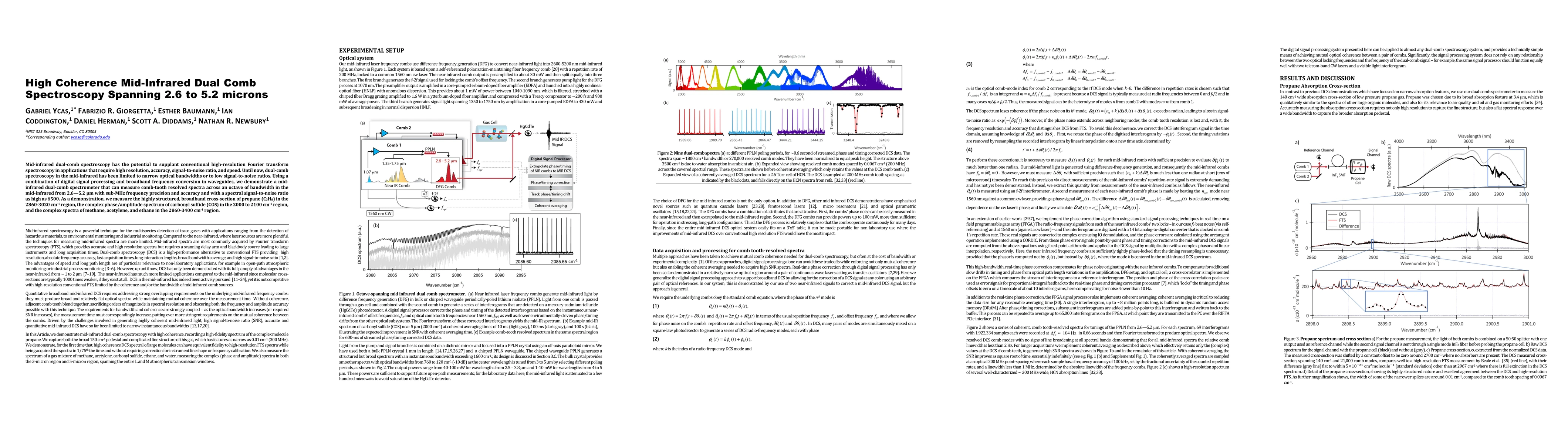 This paper presents a high-coherence mid-infrared dual-comb spectrometer covering 2.6 to 5.2 microns with sub-MHz precision and a spectral signal-to-noise ratio of 6500, demonstrating its potential to replace Fourier transform spectroscopy in high-resolution, fast measurements. Applications include detailed spectra of propane, carbonyl sulfide, and other hydrocarbons.