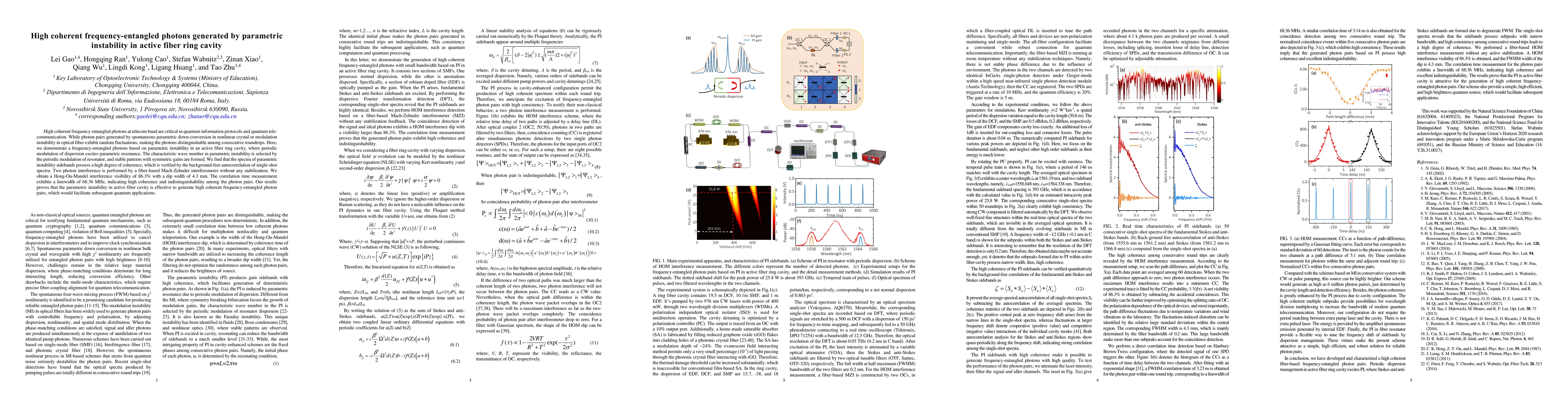 This paper demonstrates the generation of high coherent frequency-entangled photon pairs via parametric instability in an active fiber ring cavity, showing high coherence and indistinguishability, evidenced by a Hong-Ou-Mandel interference visibility of 86.3% and a correlation time linewidth of 68.36 MHz. This method promises improved performance for quantum information protocols.