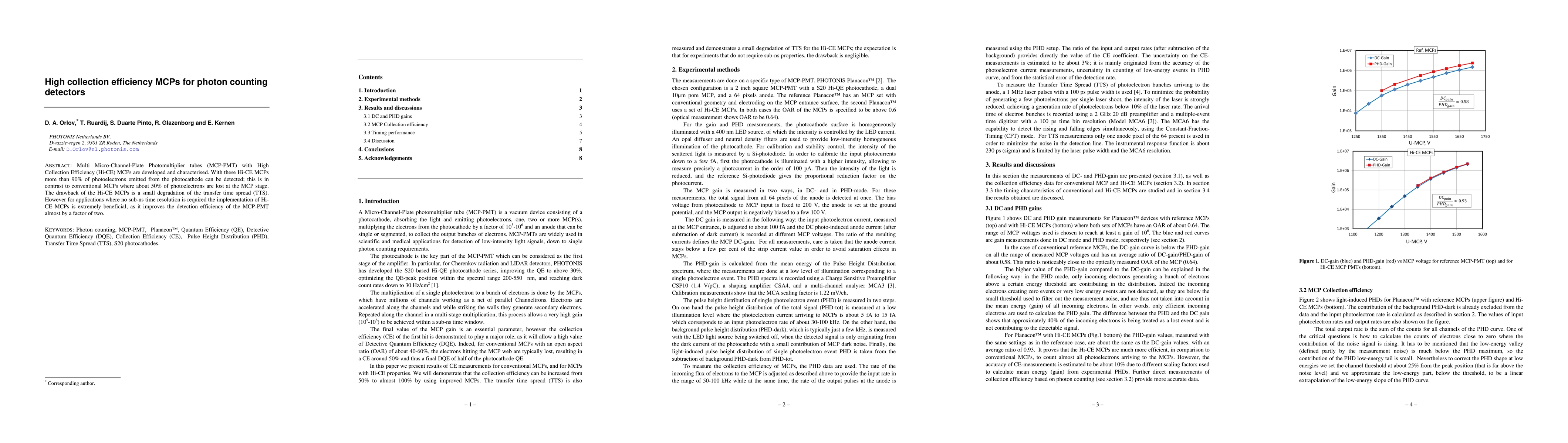 Multi Micro-Channel-Plate Photomultiplier tubes (MCP-PMT) with High Collection Efficiency (Hi-CE) MCPs are developed and characterised. With these Hi-CE MCPs more than 90% of photoelectrons emitted from the photocathode can be detected; this is in contrast to conventional MCPs where about 50% of photoelectrons are lost at the MCP stage. The drawback of the Hi-CE MCPs is a small degradation of the transfer time spread (TTS). However for applications where no sub-ns time resolution is required the implementation of Hi-CE MCPs is extremely beneficial, as it improves the detection efficiency of the MCP-PMT almost by a factor of two.