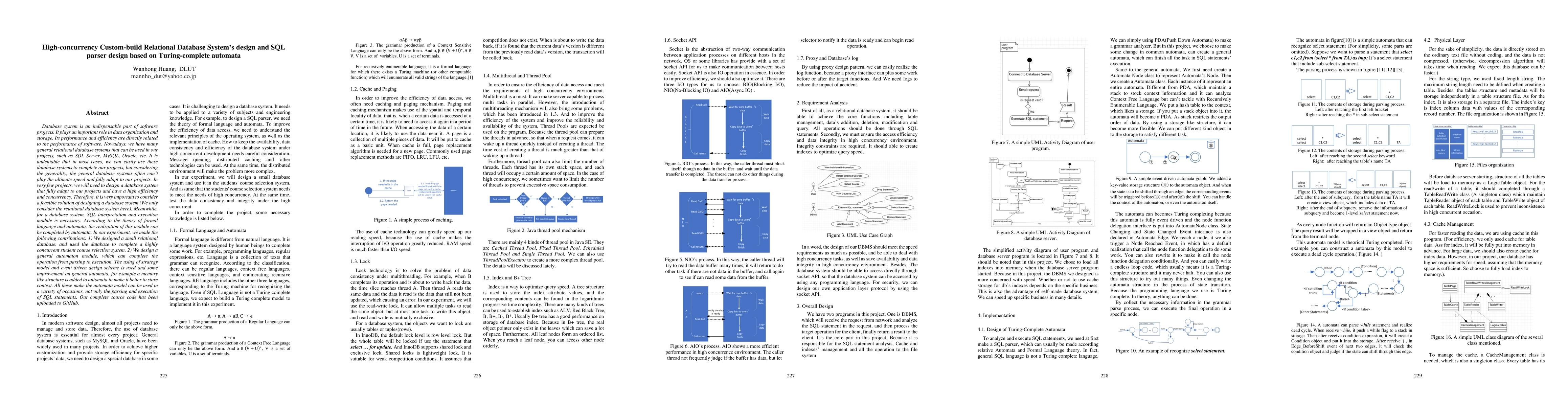 This paper presents a design for a high-concurrency custom-build relational database system and a SQL parser based on Turing-complete automata. The authors developed a small relational database and a general automaton module for parsing and executing SQL, incorporating improvements like a memory-like structure for context storage.