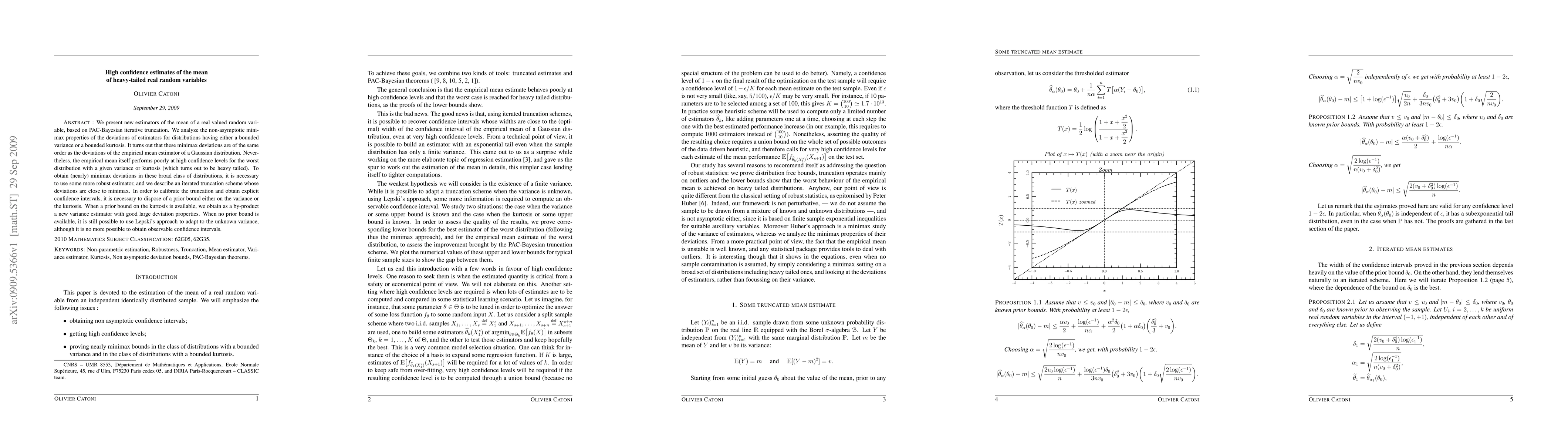 This paper introduces new estimators for the mean of heavy-tailed distributions using PAC-Bayesian iterative truncation, demonstrating their minimax properties. It shows that while the empirical mean is inadequate for high confidence levels, the proposed iterative truncation scheme provides nearly minimax deviations, requiring prior bounds on variance or kurtosis for calibration.