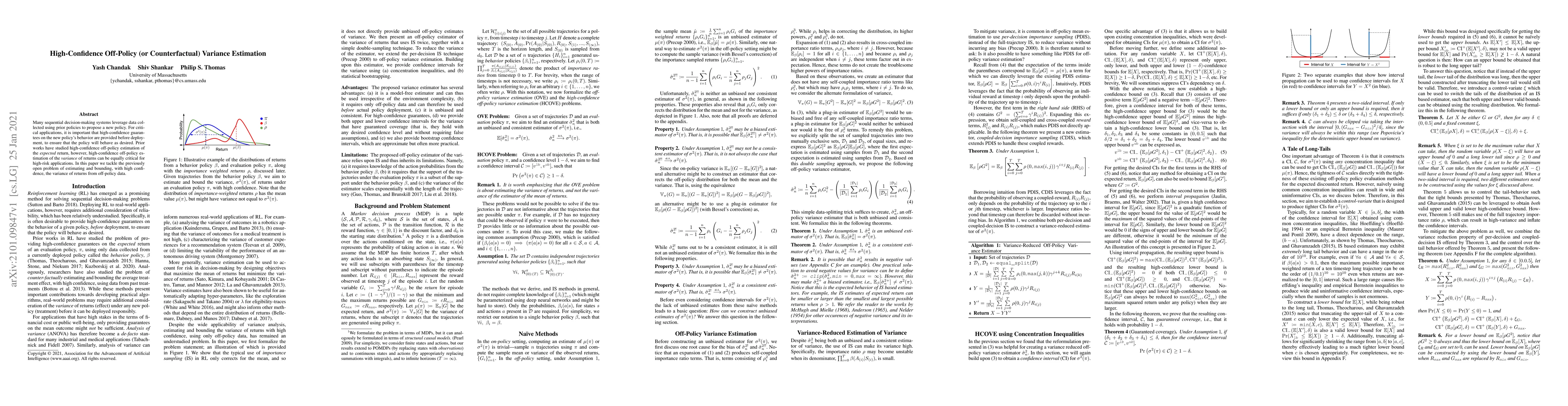 This paper addresses the challenge of estimating and providing high-confidence bounds for the variance of returns from off-policy data, which is crucial for ensuring the reliability of new policies in high-risk applications. It proposes methods to achieve this estimation, filling a gap in existing research focused on expected return estimation.