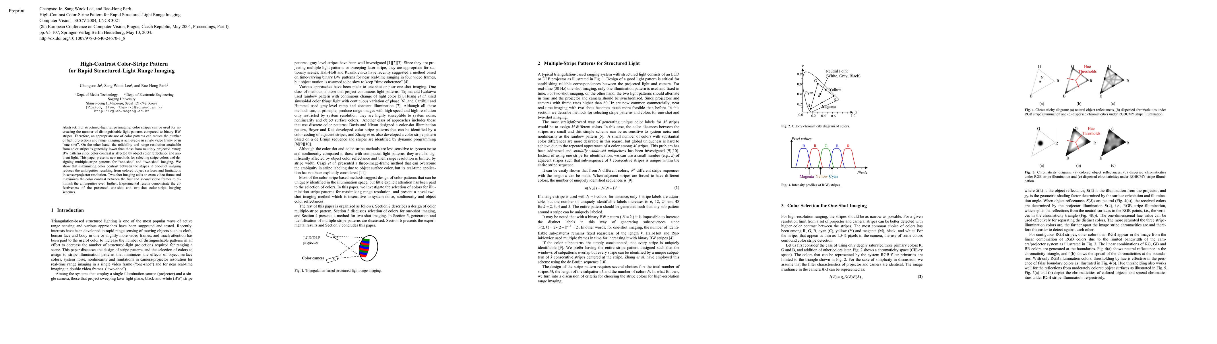 This paper proposes methods for using high-contrast color-stripe patterns to achieve rapid "one-shot" and "two-shot" structured-light range imaging, reducing ambiguities from colored objects and improving range resolution despite lower reliability compared to binary patterns. Experimental results validate the effectiveness of the proposed color-stripe imaging techniques.