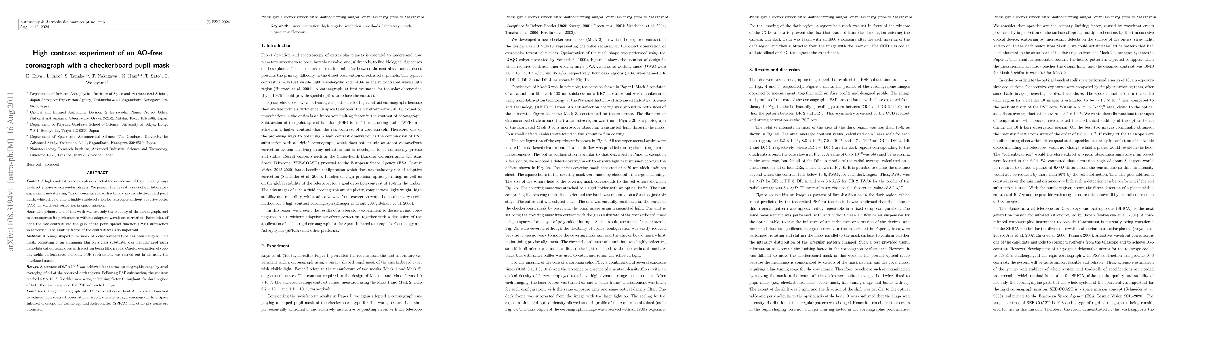 This paper presents a high contrast coronagraph experiment using a rigid, checkerboard-shaped pupil mask designed for telescopes without adaptive optics. The study achieved a raw contrast of $6.7 \times 10^{-8}$ and, after PSF subtraction, $6.8 \times 10^{-9}$, demonstrating its potential for space missions like SPICA.
