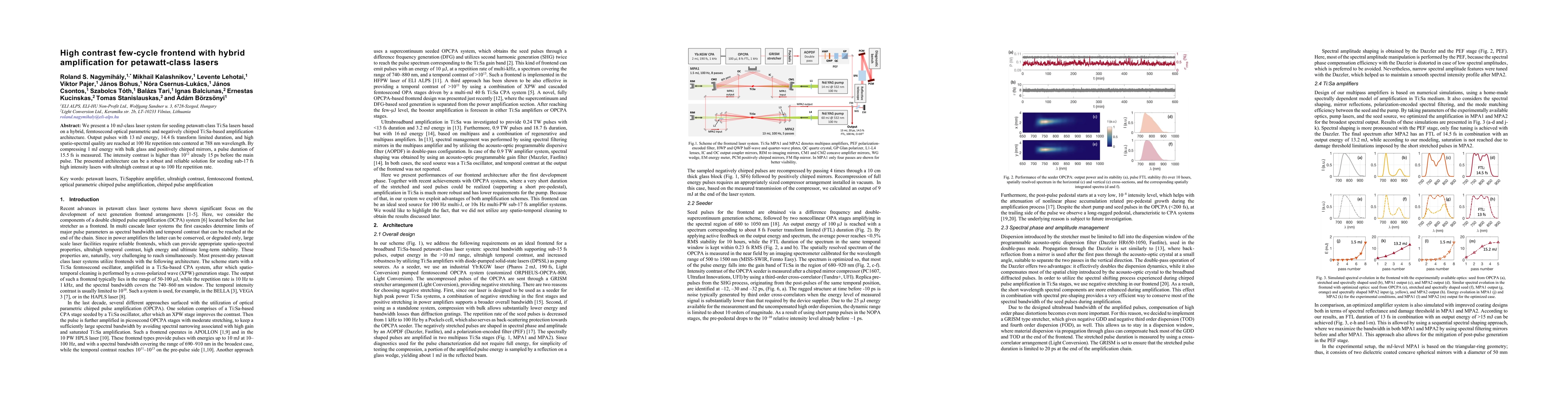 We present a 10 mJ-class laser system for seeding petawatt-class Ti:Sa lasers based on a hybrid, femtosecond optical parametric and negatively chirped Ti:Sa-based amplification architecture. Output pulses with 13 mJ energy, 14.4 fs transform limited duration, and high spatio-spectral quality are reached at 100 Hz repetition rate centered at 788 nm wavelength. By compressing 1 mJ energy with bulk glass and positively chirped mirrors, a pulse duration of 15.5 fs is measured. The intensity contrast is higher than 10$^{12}$ already 15 ps before the main pulse. The presented architecture can be a robust and reliable solution for seeding sub-17 fs high intensity lasers with ultrahigh contrast at up to 100 Hz repetition rate.