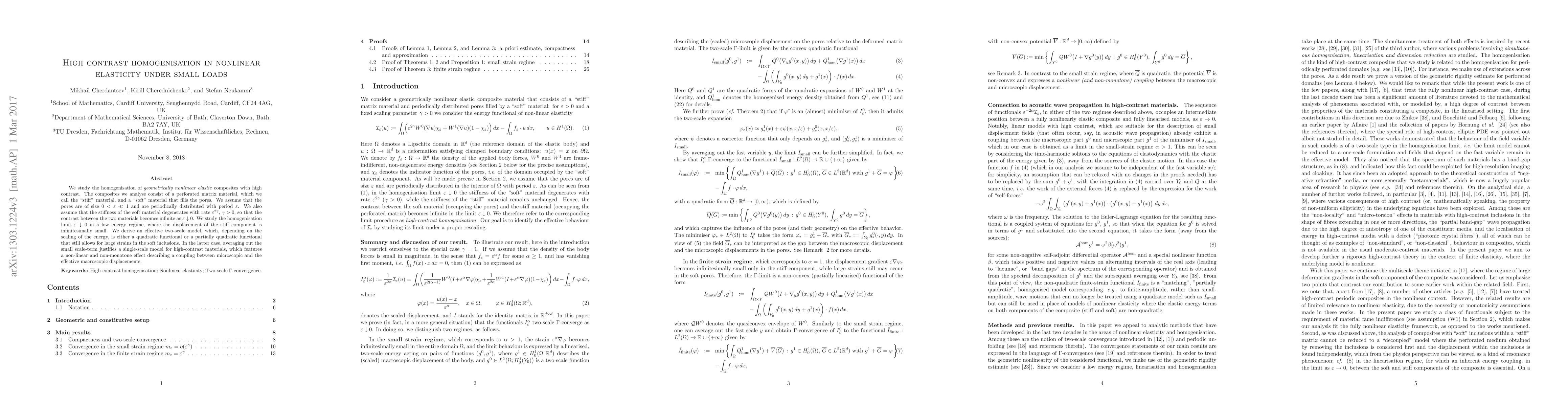 This paper explores the homogenisation of geometrically nonlinear elastic composites with high contrast, focusing on a stiff matrix with periodically distributed soft pores. It derives an effective two-scale model for small loads, revealing a non-linear and non-monotone coupling effect between microscopic and macroscopic displacements.
