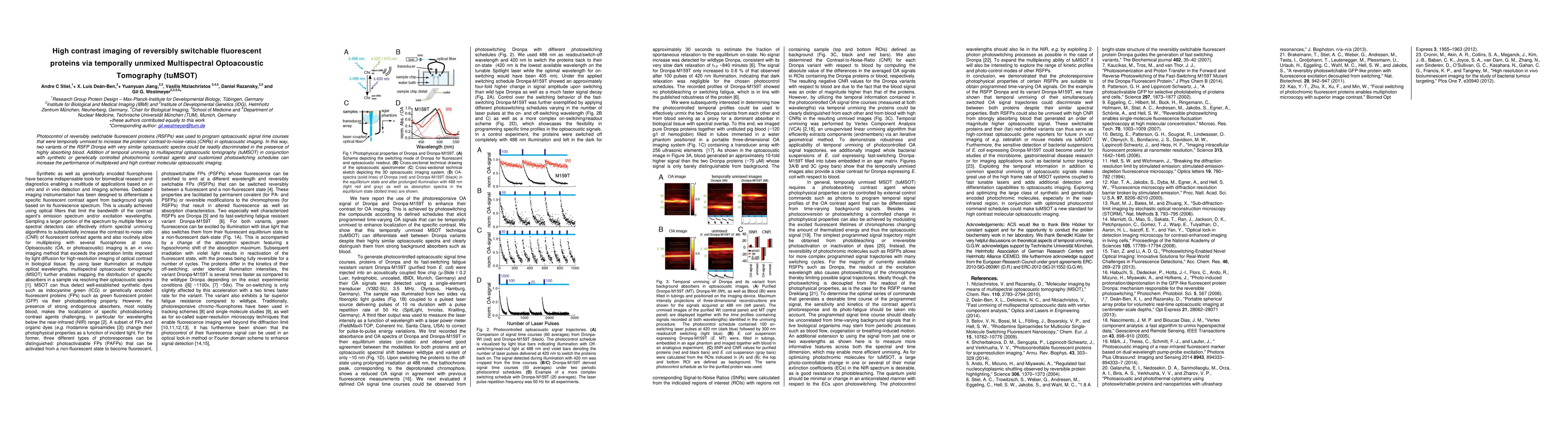 This paper demonstrates the use of temporally unmixed multispectral optoacoustic tomography (tuMSOT) to enhance the contrast-to-noise ratio of reversibly switchable fluorescent proteins (RSFPs) in imaging. By employing photocontrol of RSFPs like Dronpa and temporal unmixing, the study successfully discriminates between similar proteins even in the presence of high blood absorption, thus improving the performance of multiplexed molecular optoacoustic imaging.
