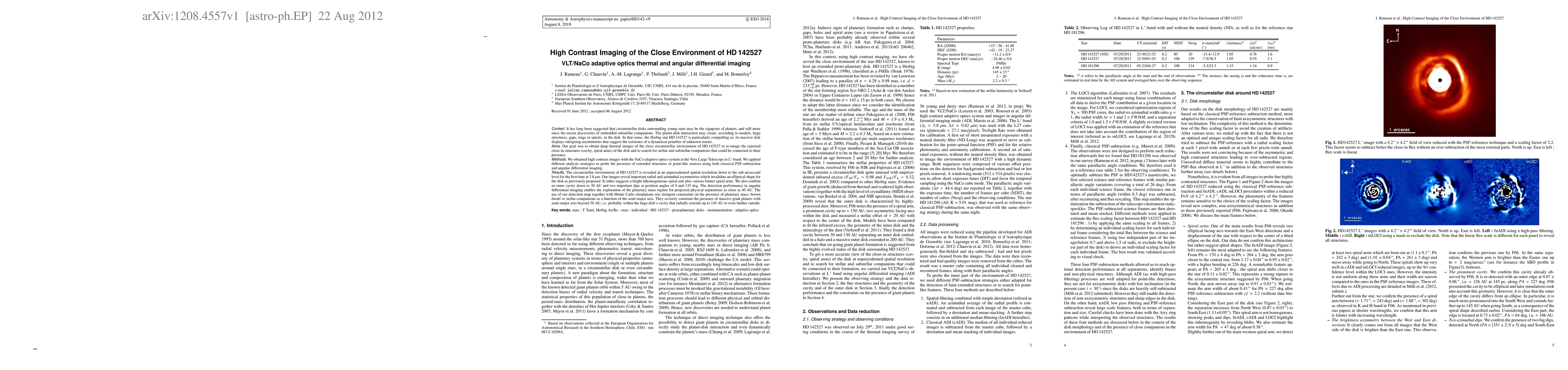Context. It has long been suggested that circumstellar disks surrounding young stars may be the signposts of planets, and still more since the recent discoveries of embedded substellar companions. The planet-disk interaction may create, according to models, large structures, gaps, rings or spirals, in the disk. In that sense, the Herbig star HD 142527 is particularly compelling as, its massive disk displays intriguing asymmetries that suggest the existence of a dynamical peturber of unknown nature. Aims. Our goal was to obtain deep thermal images of the close circumstellar environment of HD 142527 to re-image the reported close-in structures (cavity, spiral arms) of the disk and to search for stellar and substellar companions that could be connected to their presence. Results. The circumstellar environment of HD 142527 is revealed at an unprecedented spatial resolution down to the sub arcsecond level for the first time at 3.8 microns. Our images reveal important radial and azimuthal asymmetries which invalidate an elliptical shape for the disk as previously proposed. It rather suggests a bright inhomogeneous spiral arm plus various fainter spiral arms. We also confirm an inner cavity down to 30 AU and two important dips at position angles of 0 and 135 deg. The detection performance in angular differential imaging enables the exploration of the planetary mass regime for projected physical separations as close as 40 AU. The use of our detection map together with Monte Carlo simulations sets stringent constraints on the presence of planetary mass, brown dwarf or stellar companions as a function of the semi-major axis. They severely constrain the presence of massive giant planets with semi-major axis beyond 50AU, i.e. probably within the large disk's cavity that radially extends up to 145 AU or even further outside.