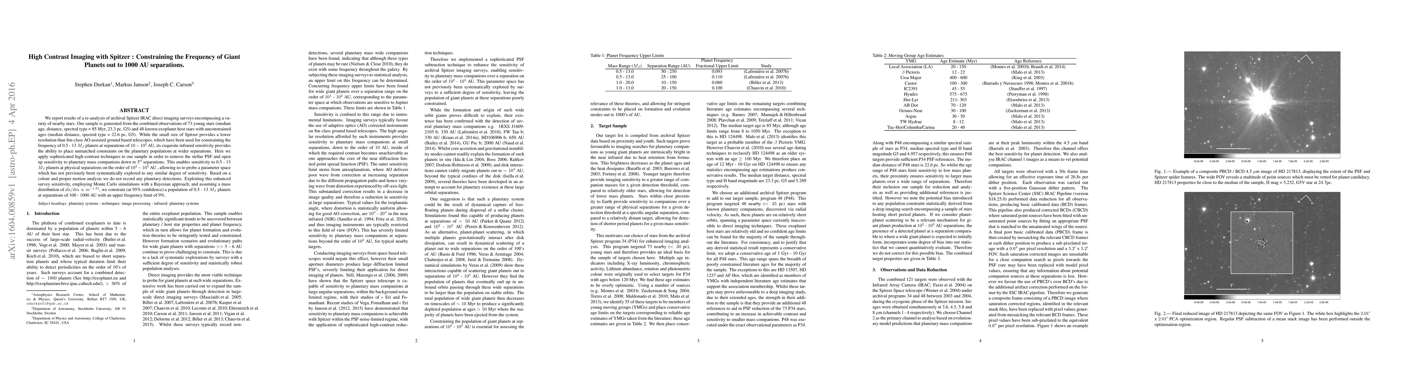 We report results of a re-analysis of archival Spitzer IRAC direct imaging surveys encompassing a variety of nearby stars. Our sample is generated from the combined observations of 73 young stars (median age, distance, spectral type = 85 Myr, 23.3 pc, G5) and 48 known exoplanet host stars with unconstrained ages (median distance, spectral type = 22.6 pc, G5). While the small size of Spitzer provides a lower resolution than 8m-class AO-assisted ground based telescopes, which have been used for constraining the frequency of 0.5 - 13 $M_J$ planets at separations of $10 - 10^2$ AU, its exquisite infrared sensitivity provides the ability to place unmatched constraints on the planetary populations at wider separations. Here we apply sophisticated high-contrast techniques to our sample in order to remove the stellar PSF and open up sensitivity to planetary mass companions down to 5\arcsec\ separations. This enables sensitivity to 0.5 - 13 $M_J$ planets at physical separations on the order of $10^2 - 10^3$ AU , allowing us to probe a parameter space which has not previously been systematically explored to any similar degree of sensitivity. Based on a colour and proper motion analysis we do not record any planetary detections. Exploiting this enhanced survey sensitivity, employing Monte Carlo simulations with a Bayesian approach, and assuming a mass distribution of $dn/dm \propto m^{-1.31}$, we constrain (at 95% confidence) a population of 0.5 - 13 $M_J$ planets at separations of 100 - 1000 AU with an upper frequency limit of 9%.