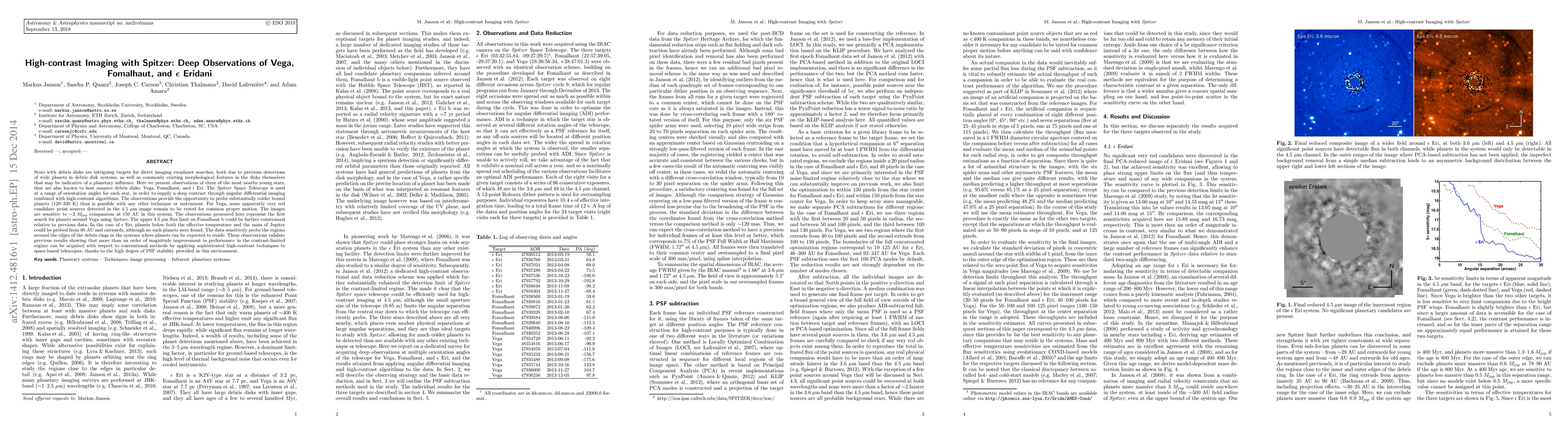 This paper uses Spitzer Space Telescope to conduct high-contrast imaging of Vega, Fomalhaut, and epsilon Eridani, probing for exoplanets in their debris disks. The study reveals potential cold planet candidates around Vega and constrains Fomalhaut b, while no low-mass planets were detected around epsilon Eridani.