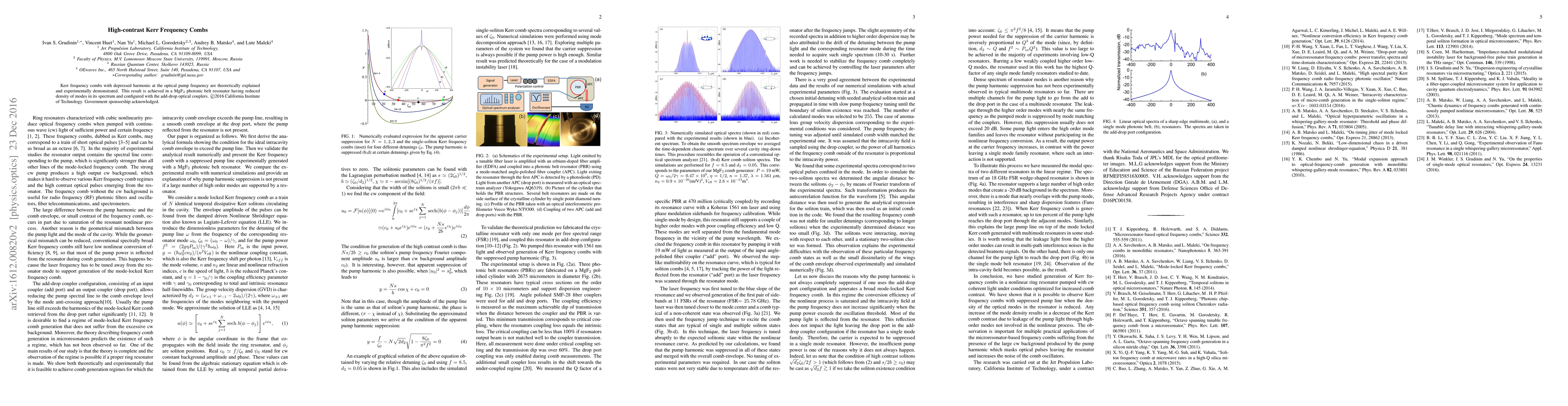 Kerr frequency combs with depressed harmonic at the optical pump frequency are theoretically explained and experimentally demonstrated. This result is achieved in a MgF$_2$ photonic belt resonator having reduced density of modes in its spectrum and configured with the add-drop optical couplers. \copyright 2016 California Institute of Technology. Government sponsorship