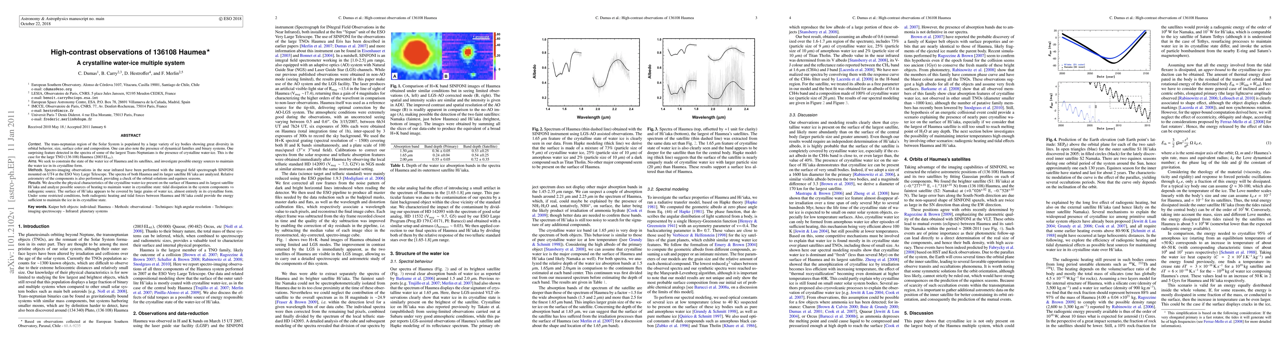 This research presents high-contrast observations of Haumea, a trans-Neptunian object, and its satellite Hi'iaka, revealing crystalline water-ice on their surfaces. Using SINFONI spectro-imaging at ESO's VLT, the study identifies large crystalline water ice grains on Hi'iaka and analyzes potential heating sources maintaining this state, including tidal dissipation and radiogenic heating.