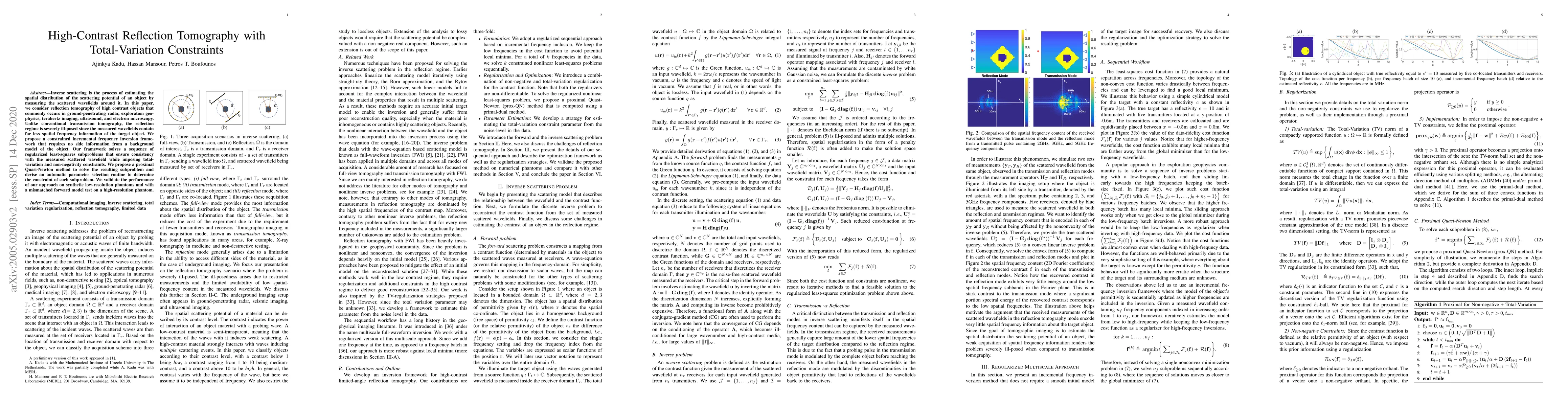 Inverse scattering is the process of estimating the spatial distribution of the scattering potential of an object by measuring the scattered wavefields around it. In this paper, we consider reflection tomography of high contrast objects that commonly occurs in ground-penetrating radar, exploration geophysics, terahertz imaging, ultrasound, and electron microscopy. Unlike conventional transmission tomography, the reflection regime is severely ill-posed since the measured wavefields contain far less spatial frequency information of the target object. We propose a constrained incremental frequency inversion framework that requires no side information from a background model of the object. Our framework solves a sequence of regularized least-squares subproblems that ensure consistency with the measured scattered wavefield while imposing total-variation and non-negativity constraints. We propose a proximal Quasi-Newton method to solve the resulting subproblem and devise an automatic parameter selection routine to determine the constraint of each subproblem. We validate the performance of our approach on synthetic low-resolution phantoms and with a mismatched forward model test on a high-resolution phantom.