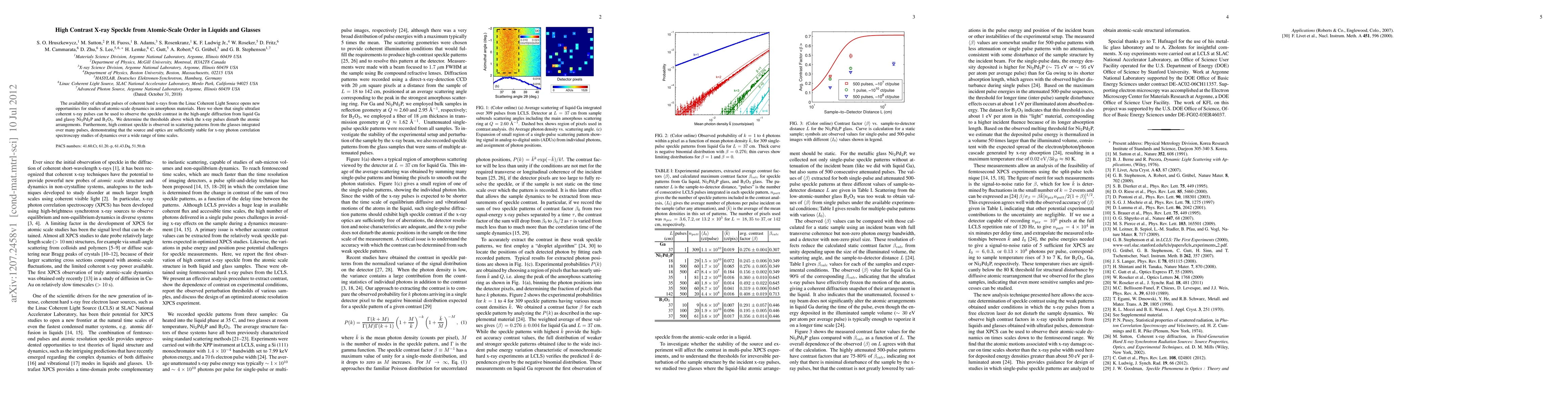 This research demonstrates the use of ultrafast coherent x-ray pulses to observe high-contrast x-ray speckle from atomic-scale order in liquids and glasses, revealing the thresholds for x-ray pulse-induced atomic arrangement disturbances. The study also shows stable scattering patterns over many pulses, enabling x-ray photon correlation spectroscopy for dynamic studies.
