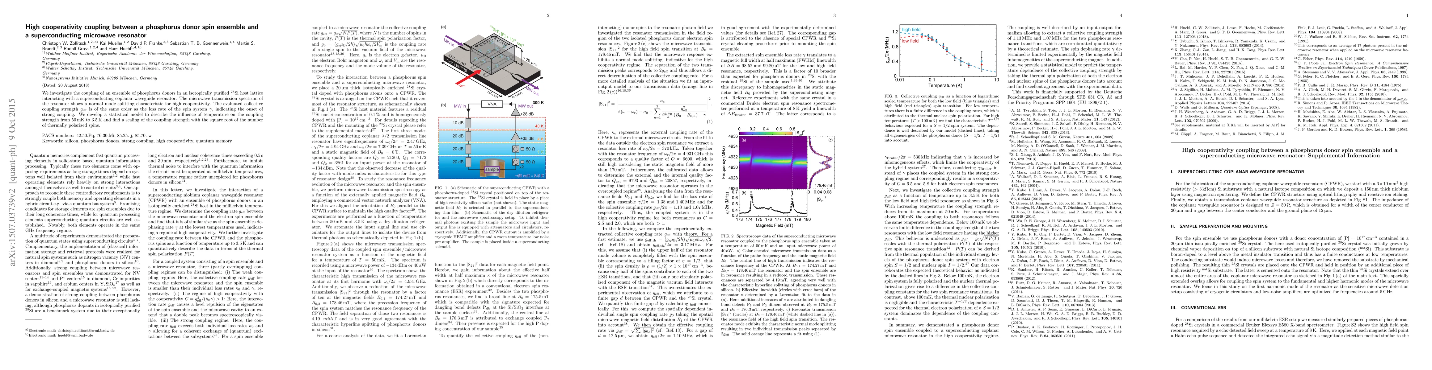 This paper explores the strong coupling between an ensemble of phosphorus donors in silicon and a superconducting microwave resonator, demonstrating high cooperativity through normal mode splitting in the resonator's transmission spectrum. The study reveals a collective coupling strength comparable to the spin system's loss rate, indicating the onset of strong coupling, and models the temperature-dependent coupling strength scaling with the square root of thermally polarized spins.