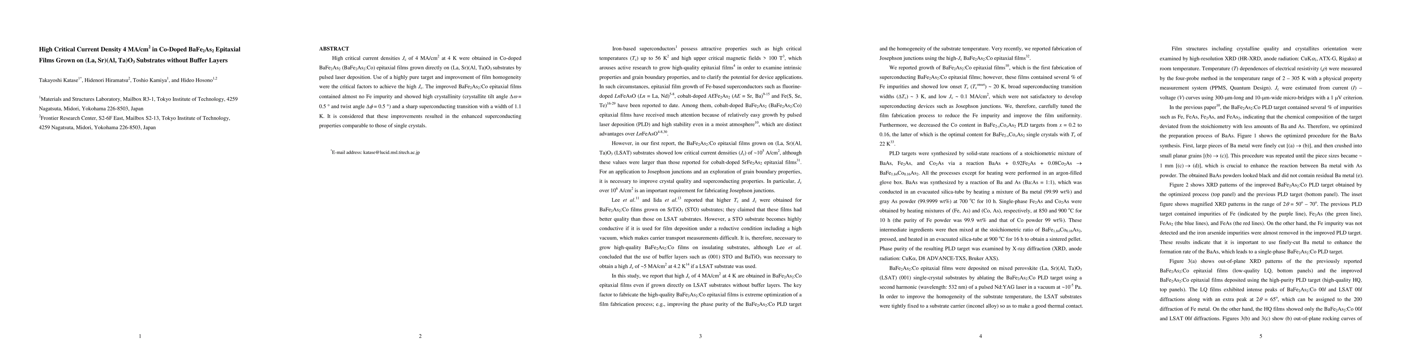 This paper reports high critical current densities of 4 MA/cm² at 4 K in Co-doped BaFe₂As₂ epitaxial films grown on (La, Sr)(Al, Ta)O₃ substrates without buffer layers. The high Jc was achieved through the use of a highly pure target and improved film homogeneity, leading to minimal Fe impurities and high crystallinity.