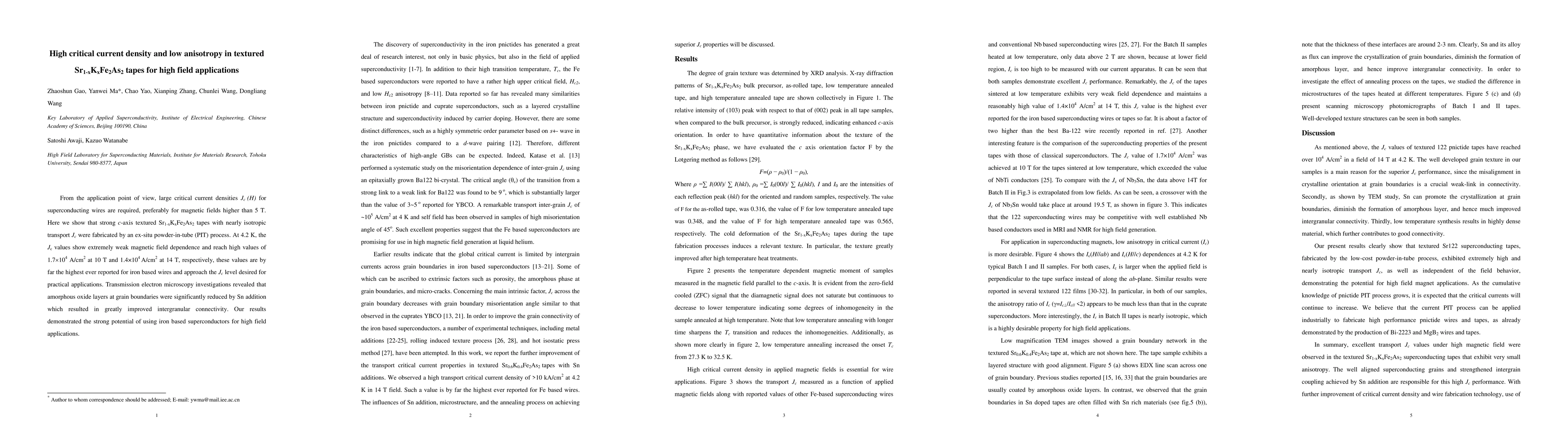 This paper reports the fabrication of textured Sr1-xKxFe2As2 tapes with high critical current density and low anisotropy, achieving Jc values of up to 1.7x10^4 A/cm^2 at 10 T. The Sn addition improved intergranular connectivity, indicating strong potential for iron-based superconductors in high field applications.