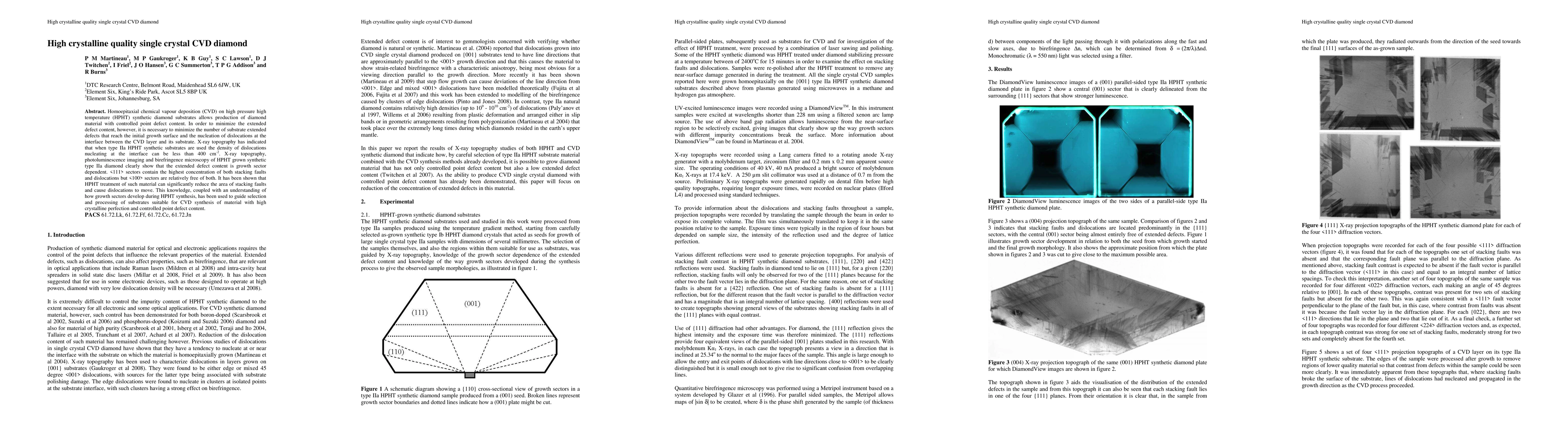 This paper discusses the production of high crystalline quality single crystal CVD diamond using homoepitaxial CVD on HPHT synthetic substrates, emphasizing the reduction of extended defects through substrate selection and HPHT treatment. It highlights that <100> growth sectors exhibit fewer defects, while <111> sectors have higher defect concentrations, and HPHT treatment can further minimize defects.