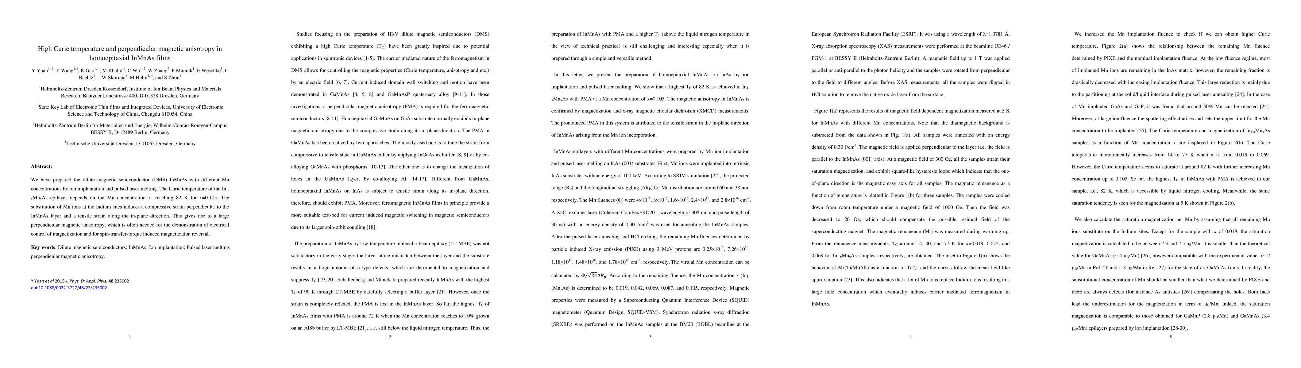 Summary: This study investigates InMnAs films with varying Mn concentrations, achieving a high Curie temperature of 82 K for x=0.105. The Mn substitution induces strain leading to significant perpendicular magnetic anisotropy, crucial for electrical control of magnetization and spin-transfer-torque applications.