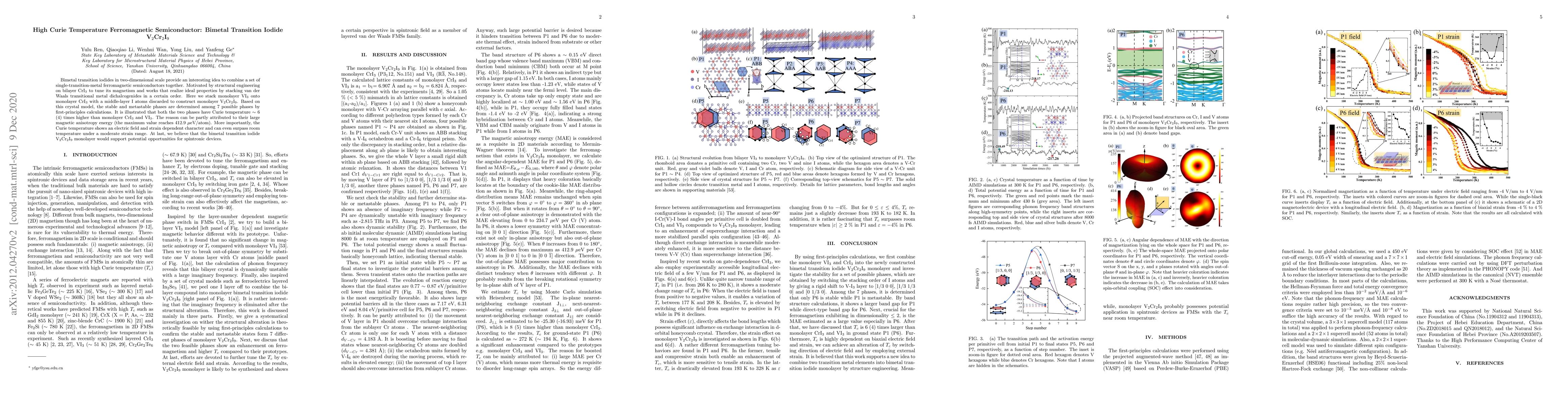 The research introduces a new ferromagnetic semiconductor, monolayer V$_2$Cr$_2$I$_9$, created by stacking monolayer VI$_3$ onto monolayer CrI$_3$ with a middle-layer I atoms removed. This material exhibits Curie temperature significantly higher (up to ~6 times) than its components, due to large magnetic anisotropy energy. The Curie temperature is also shown to be electric field and strain dependent, potentially surpassing room temperature under moderate strain, suggesting promising applications in spintronic devices.