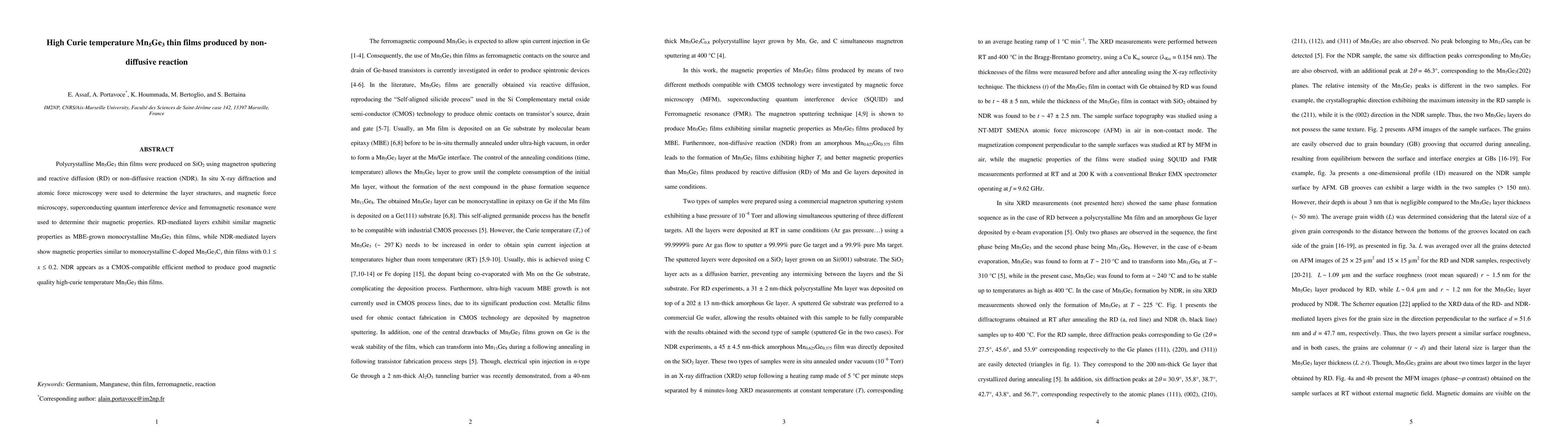 This study produced high Curie temperature Mn5Ge3 thin films via non-diffusive reaction (NDR) using magnetron sputtering, showing magnetic properties akin to C-doped Mn5Ge3 films. NDR offers a CMOS-compatible method for creating high-quality magnetic films.
