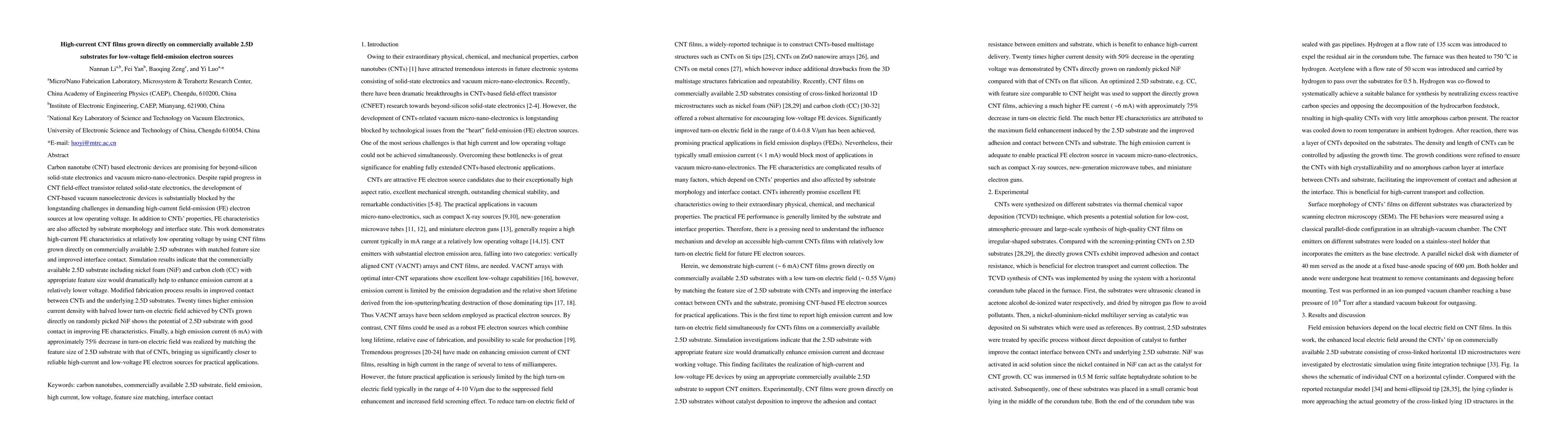 This paper demonstrates the growth of high-current carbon nanotube (CNT) films directly on commercially available 2.5D substrates for low-voltage field-emission electron sources, achieving a 20 times higher emission current density and a 75 percent decrease in turn-on electric field by optimizing substrate-CNT interface contact. The study highlights the potential of 2.5D substrates in enhancing field-emission characteristics for practical applications.