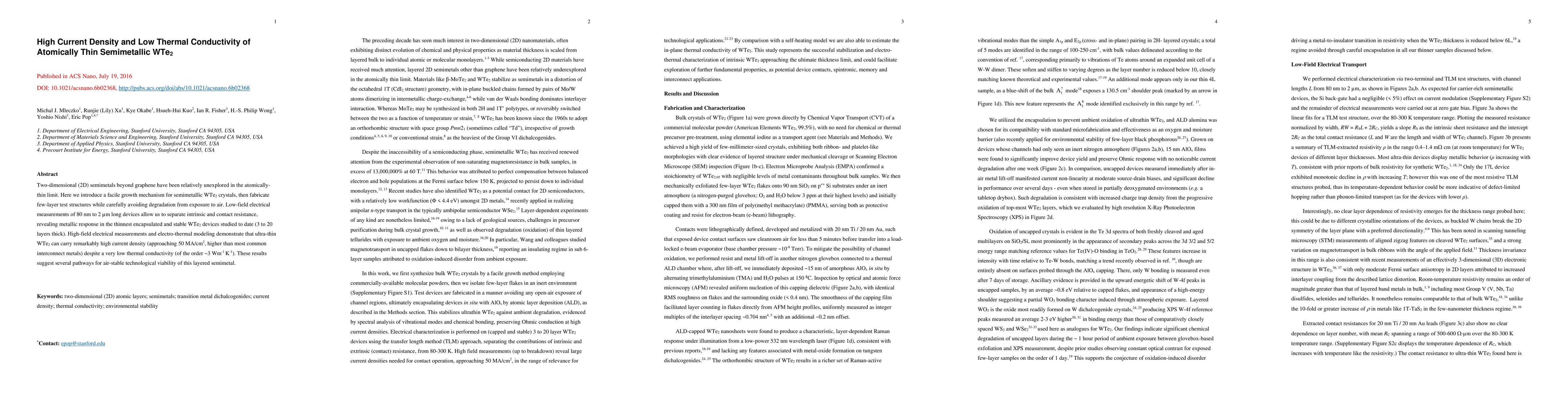 This paper presents a method for growing semimetallic WTe2 crystals and demonstrates their high current density capabilities (up to 50 MA/cm²) despite low thermal conductivity (~3 W/m/K), indicating potential for technological applications.
