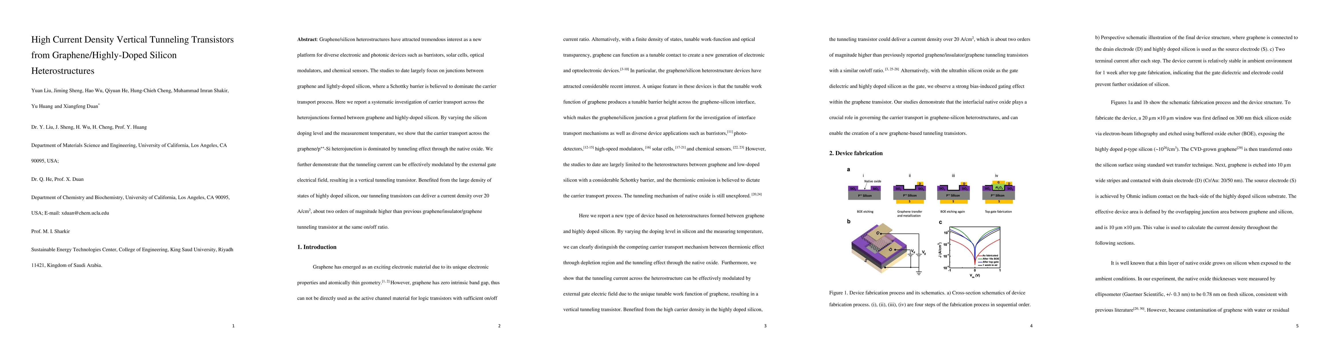 This study investigates carrier transport across graphene/highly-doped silicon heterojunctions, showing that tunneling through the native oxide dominates the process. It demonstrates a vertical tunneling transistor with current densities over 20 A/cm², significantly higher than previous graphene-based transistors.