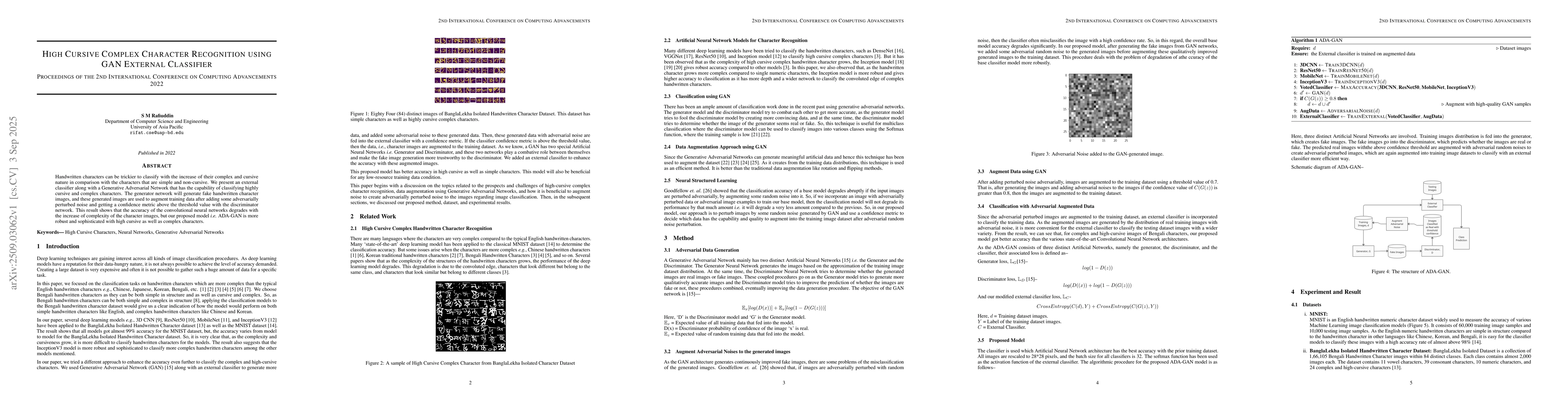 Handwritten characters can be trickier to classify due to their complex and cursive nature compared to simple and non-cursive characters. We present an external classifier along with a Generative Adversarial Network that can classify highly cursive and complex characters. The generator network produces fake handwritten character images, which are then used to augment the training data after adding adversarially perturbed noise and achieving a confidence score above a threshold with the discriminator network. The results show that the accuracy of convolutional neural networks decreases as character complexity increases, but our proposed model, ADA-GAN, remains more robust and effective for both cursive and complex characters.