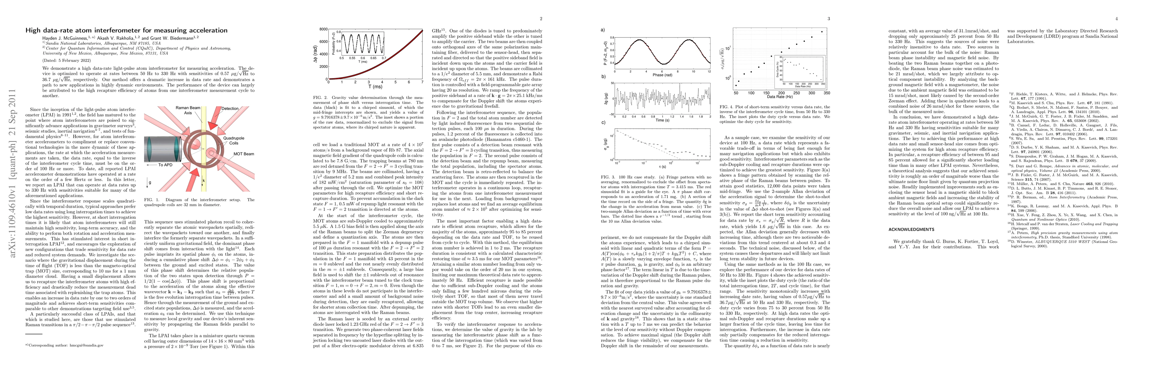 This paper presents a high data-rate light-pulse atom interferometer capable of measuring acceleration at rates up to 330 Hz, with sensitivity ranging from 0.57 to 36.7 μg/rtHz. The device's performance is significantly enhanced by high recapture efficiency of atoms between measurement cycles, paving the way for new applications in dynamic environments.