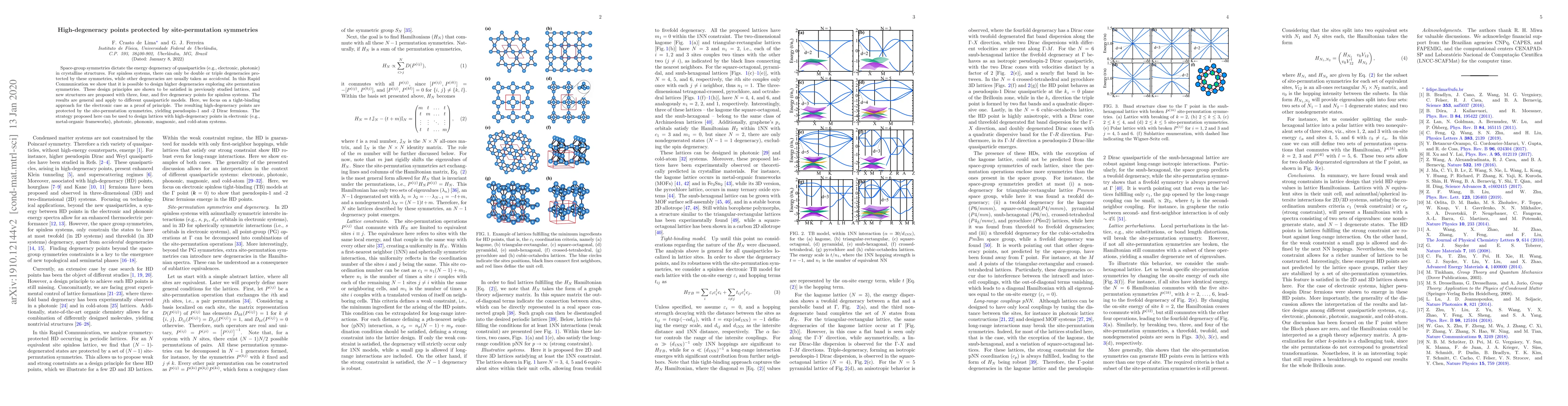 This paper demonstrates how site-permutation symmetries can be exploited to design quasiparticle systems with higher degeneracies than typically allowed by space group symmetries, proposing new lattice structures with three to five degeneracy points. The findings apply to various quasiparticle models and are illustrated using a tight-binding model for electronic systems.