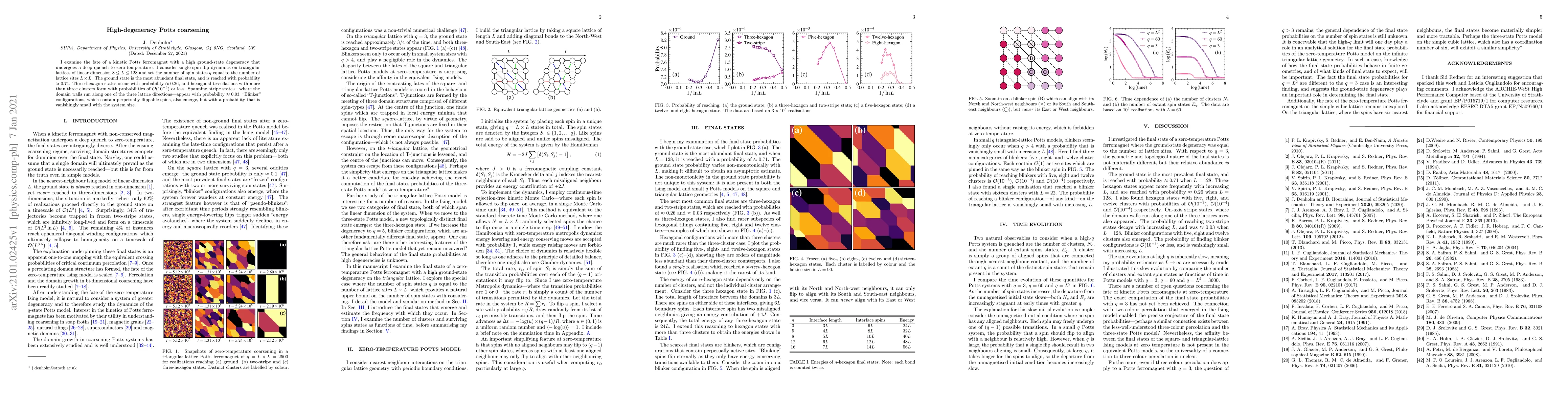 I examine the fate of a kinetic Potts ferromagnet with a high ground-state degeneracy that undergoes a deep quench to zero-temperature. I consider single spin-flip dynamics on triangular lattices of linear dimension $8 \le L \le 128$ and set the number of spin states $q$ equal to the number of lattice sites $L \times L$. The ground state is the most abundant final state, and is reached with probability $\approx 0.71$. Three-hexagon states occur with probability $\approx 0.26$, and hexagonal tessellations with more than three clusters form with probabilities of $\mathcal{O}(10^{-3})$ or less. Spanning stripe states -- where the domain walls run along one of the three lattice directions -- appear with probability $\approx 0.03$. "Blinker" configurations, which contain perpetually flippable spins, also emerge, but with a probability that is vanishingly small with the system size.
