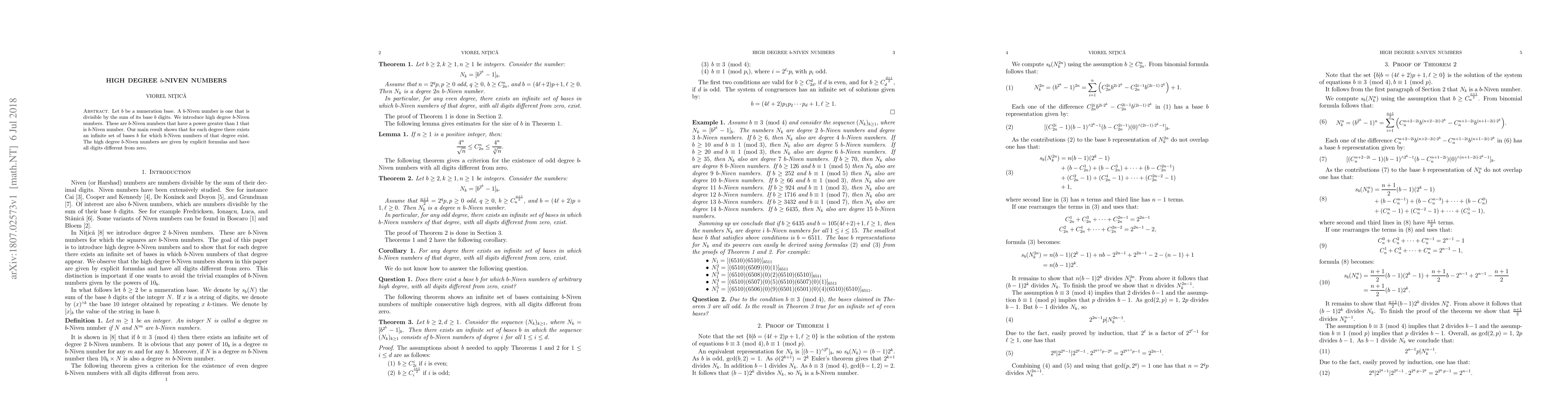 The paper presents explicit formulas for high degree b-Niven numbers and proves the existence of such numbers for infinite sets of bases for any given degree.
