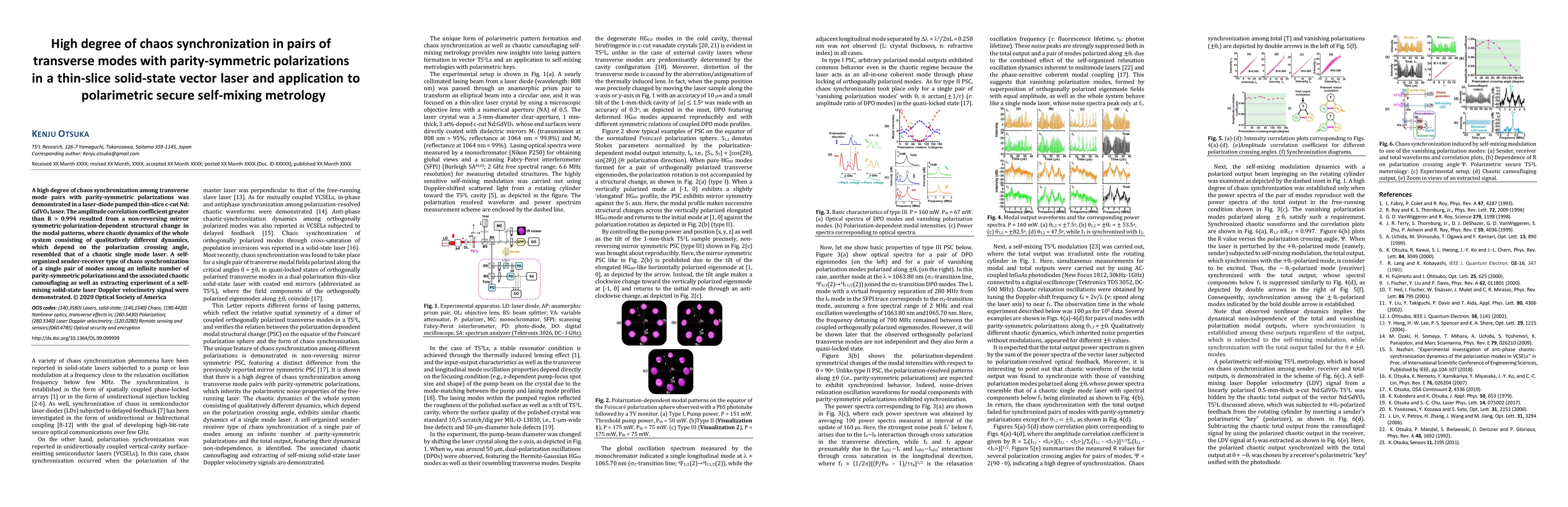 A high degree of chaos synchronization among transverse mode pairs with parity-symmetric polarizations was demonstrated in a laser-diode pumped thin-slice c-cut Nd: GdVO4 laser. The amplitude correlation coefficient greater than R > 0.994 resulted from a non-reversing mirror symmetric-polarization-dependent structural change in the modal patterns, where chaotic dynamics of the whole system consisting of qualitatively different dynamics, which depend on the polarization crossing angle, resembled that of a chaotic single mode laser. A self-organized sender-receiver type of chaos synchronization of a single pair of modes among an infinite number of parity-symmetric polarizations and the associated chaotic camouflaging as well as extracting experiment of a self-mixing solid-state laser Doppler velocimetry signal were demonstrated.