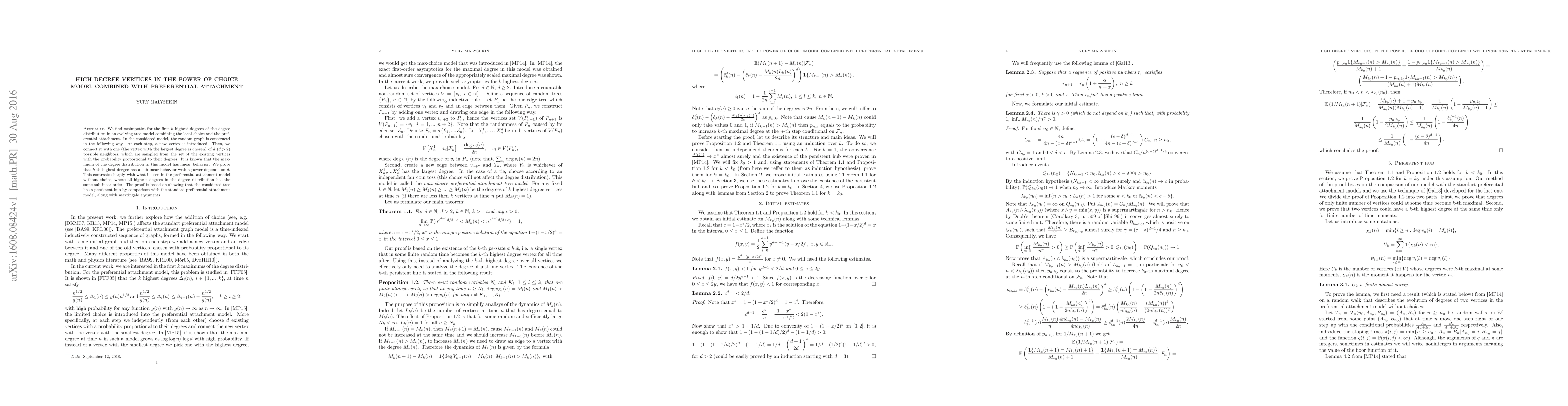 We find assimpotics for the first $k$ highest degrees of the degree distribution in an evolving tree model combining the local choice and the preferential attachment. In the considered model, the random graph is constructd in the following way. At each step, a new vertex is introduced. Then, we connect it with one (the vertex with the largest degree is chosen) of $d$ ($d>2$) possible neighbors, which are sampled from the set of the existing vertices with the probability proportional to their degrees. It is known that the maximum of the degree distribution in this model has linear behavior. We prove that $k$-th highest dergee has a sublinear behavior with a power depends on $d$. This contrasts sharply with what is seen in the preferential attachment model without choice, where all highest degrees in the degree distribution has the same sublinear order. The proof is based on showing that the considered tree has a persistent hub by comparison with the standard preferential attachment model, along with martingale arguments.