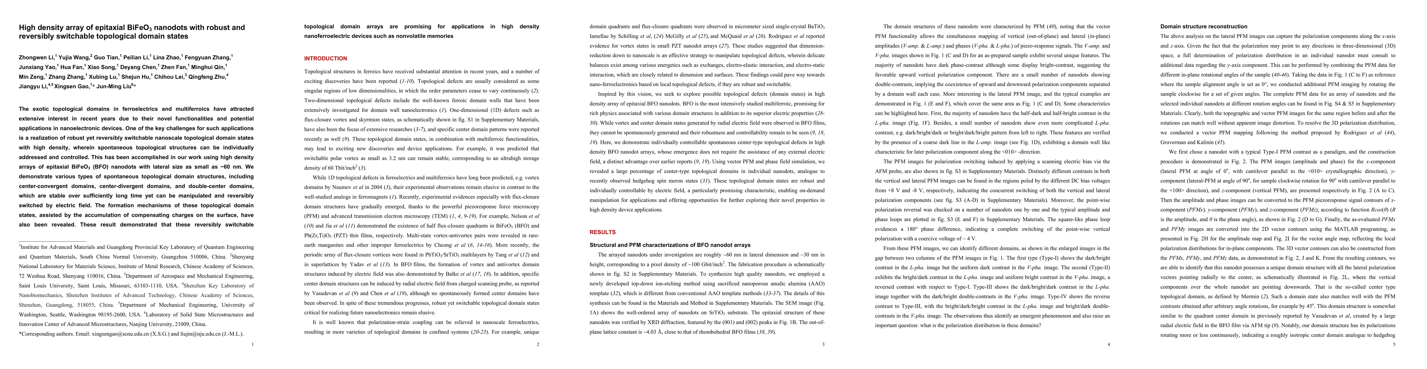 This paper presents a high-density array of epitaxial BiFeO3 nanodots that exhibit robust, reversibly switchable topological domain states, showcasing potential for advanced nanoelectronic devices like nonvolatile memories. The study reveals the formation mechanisms of various topological structures and their manipulation by electric fields.