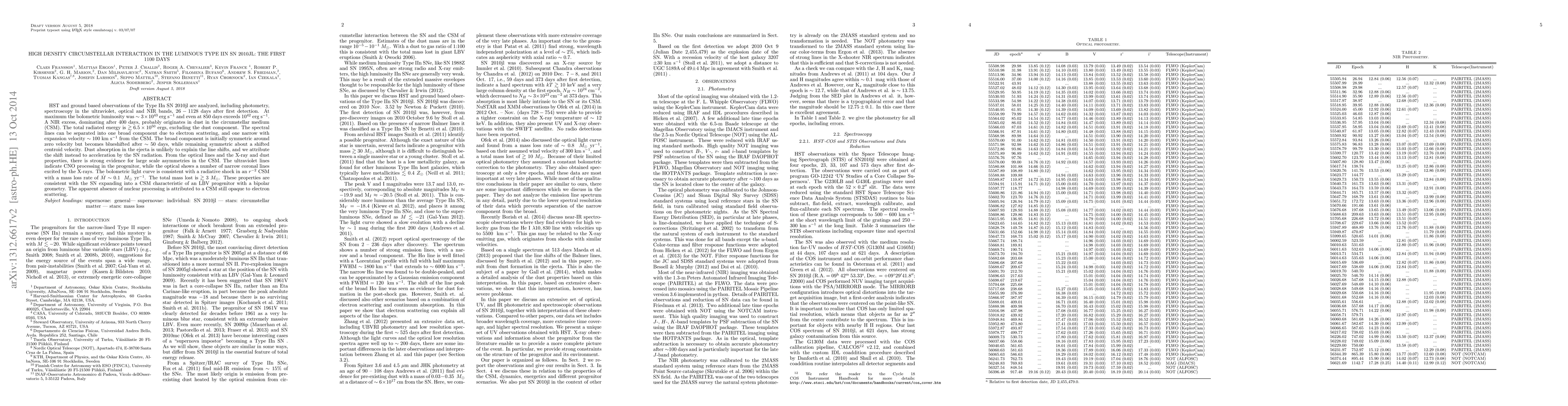 HST and ground based observations of the Type IIn SN 2010jl are analyzed, including photometry, spectroscopy in the ultraviolet, optical and NIR bands, 26-1128 days after first detection. At maximum the bolometric luminosity was $\sim 3\times10^{43}$ erg/s and even at 850 days exceeds $10^{42}$ erg/s. A NIR excess, dominating after 400 days, probably originates in dust in the circumstellar medium (CSM). The total radiated energy is $> 6.5\times10^{50}$ ergs, excluding the dust component. The spectral lines can be separated into one broad component due to electron scattering, and one narrow with expansion velocity $\sim 100$ km/s from the CSM. The broad component is initially symmetric around zero velocity but becomes blueshifted after $\sim 50$ days, while remaining symmetric about a shifted centroid velocity. Dust absorption in the ejecta is unlikely to explain the line shifts, and we attribute the shift instead to acceleration by the SN radiation. From the optical lines and the X-ray and dust properties, there is strong evidence for large scale asymmetries in the CSM. The ultraviolet lines indicate CNO processing in the progenitor, while the optical shows a number of narrow coronal lines excited by the X-rays. The bolometric light curve is consistent with a radiative shock in an $r^{-2}$ CSM with a mass loss rate of $\sim 0.1$ M_sun/yr. The total mass lost is $> 3$ M_sun. These properties are consistent with the SN expanding into a CSM characteristic of an LBV progenitor with a bipolar geometry. The apparent absence of nuclear processing is attributed to a CSM still opaque to electron scattering.