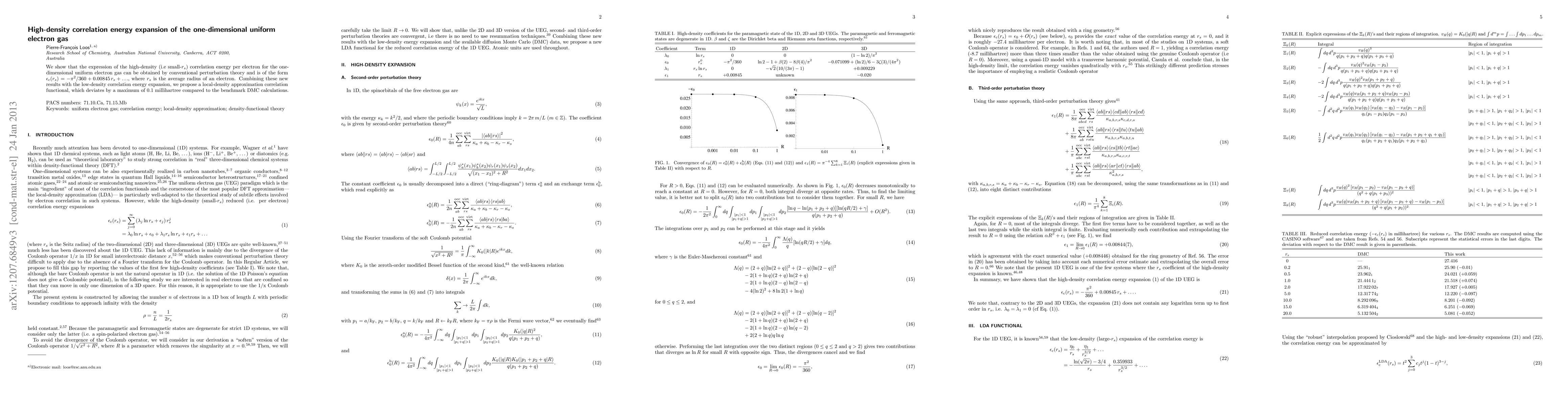 This paper presents a high-density correlation energy expansion for the one-dimensional uniform electron gas using conventional perturbation theory, yielding $\Ec(r_s) = -\pi^2/360 + 0.00845 r_s + ...$, and proposes a local-density approximation correlation functional that shows a maximum deviation of 0.1 millihartree from benchmark calculations.